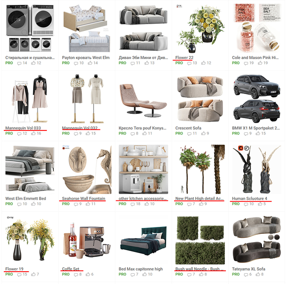Если это не название бренда, то я бы рекомендовал перед заливкой по-русски обзывать. Потому что Flower 19 элементарно неудобно искать. Аналогично с Bush... , Bed Max capitone high, Mannequin и т.д.