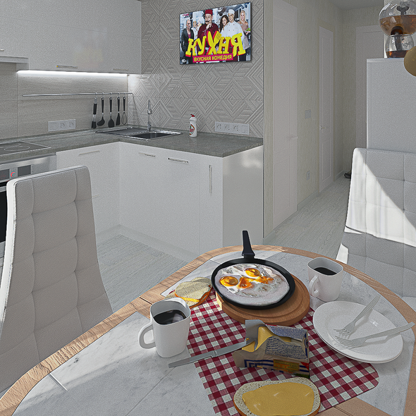Всем доброго времени суток. Работа нуждается в доработке. Визуализация выполнена по реальному дизайн-проекту квартиры. Выставляю кухню и прихожую, в запасе остаётся детская, гостиная, ванна и туалет. Заранее признателен за дельные замечания.
