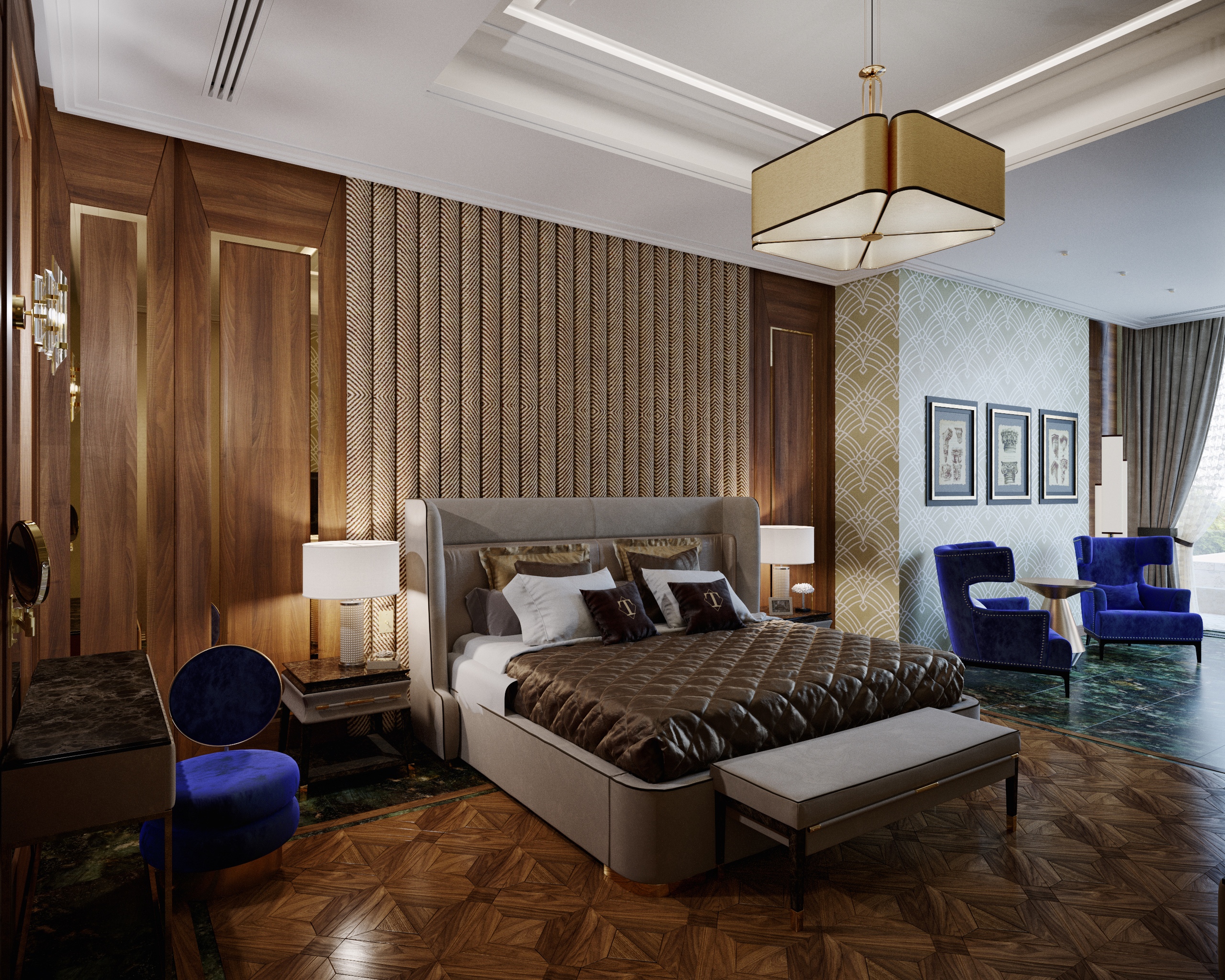 Доброго времени суток! Впервые решил выставить сюда в wip свою работу в процессе. Это спальня хозяйская в большом доме в Ставропольском крае. Нужно создать некий респектабельный современный арт деко. Должно быть дорого, элитно, со вкусом, не совдеповски и не "по гостиничному". Пока что получается, на мой взгляд, по совдеповски и по гостиничному... Но от современных приемов приходится отказаться. все же это спальня для людей взрослых, состоявшихся, представителей "того поколения". В общем вот, что скажете, хочу сделать прям идеально, круто, надеюсь получу здесь хоть пару тройку дельных советов!) Выкладываю 2 картинки в ходе разработки...пока т , к чему я пришел