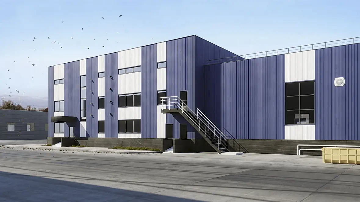 Было бы хорошо доработать текстуру асфальта, и расставить машины. Как правило, парковка на всех промышленных обьектах расчерчена. Деревья кажутся плоскими, и непонятно, откуда налетели листья, коли на рендере деревьев с листвой попросту нет. Размер листочков, мне кажется, великоват