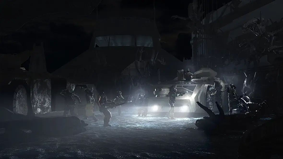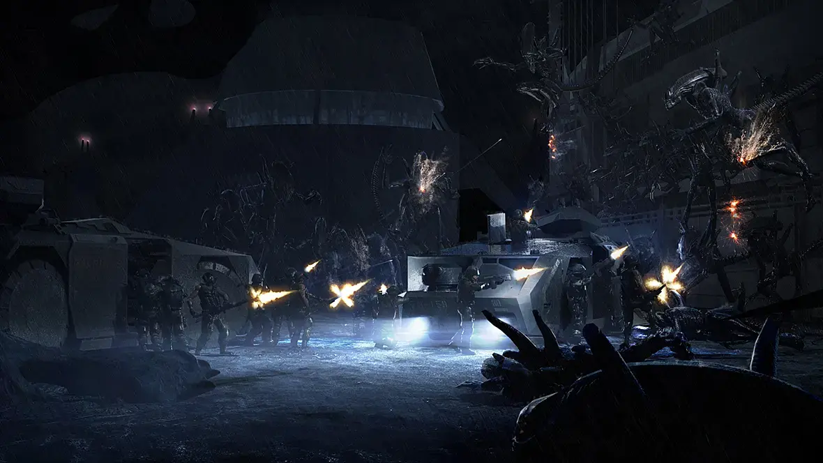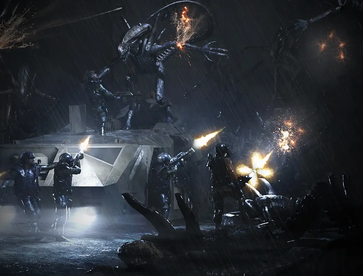 Ну и добавил бы мелких эффектов и деталей, связанных с дождём - брызги от поверхностей, смываемая водой кровь ксеноморфа на переднем плане.