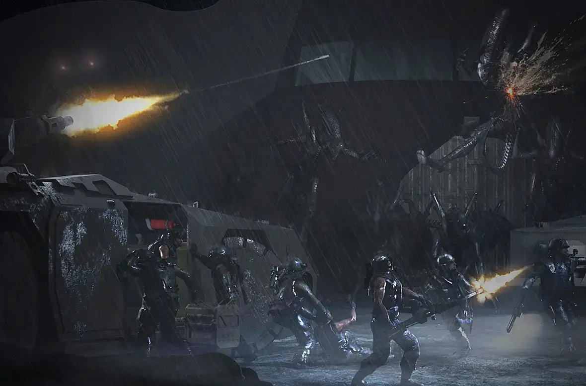 Ну и добавил бы мелких эффектов и деталей, связанных с дождём - брызги от поверхностей, смываемая водой кровь ксеноморфа на переднем плане.
