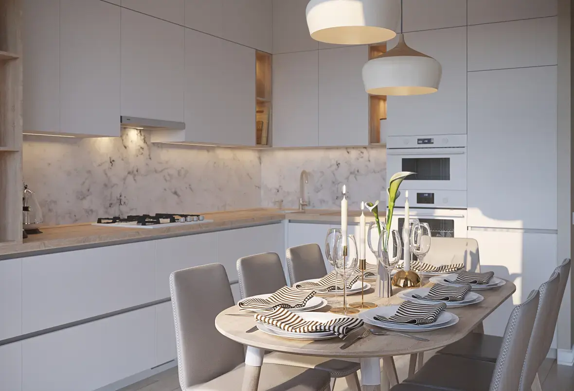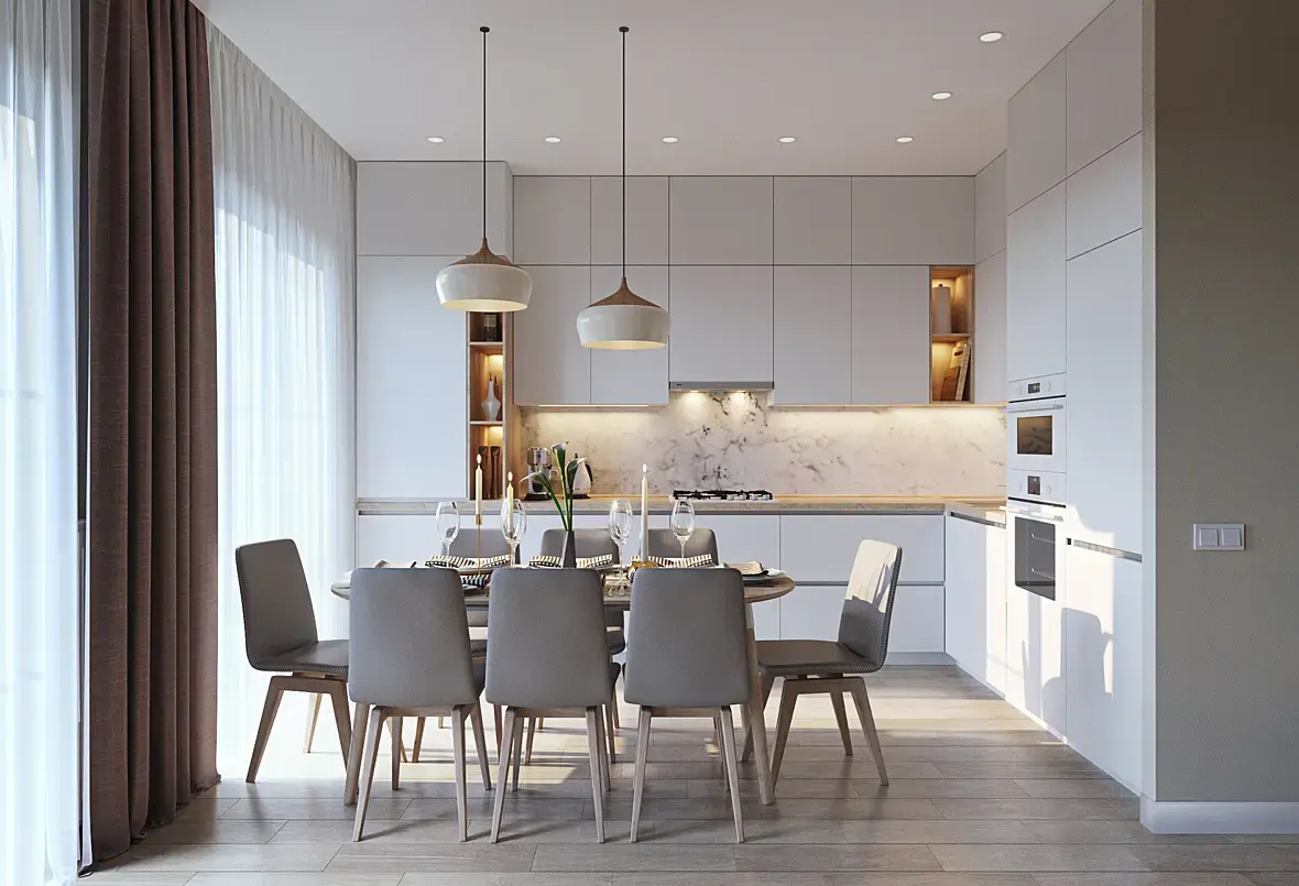 Не помешали бы яркие пятна, акценты. Например стулья бордовые. Фартук из черного закаленного стекла.