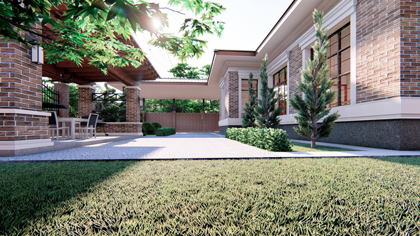 я бы не делал такой широкий угол камеры. Потом в экстерьерах главное - это найти красивую тень, чтоб картинка играла, покрутить солнце, сейчас не самый лучший вариант. Кирпич и камни плосковаты. Траву можно повыше, добавить пучков и разнообразия .Исправляй это пока, потом посмотрим.