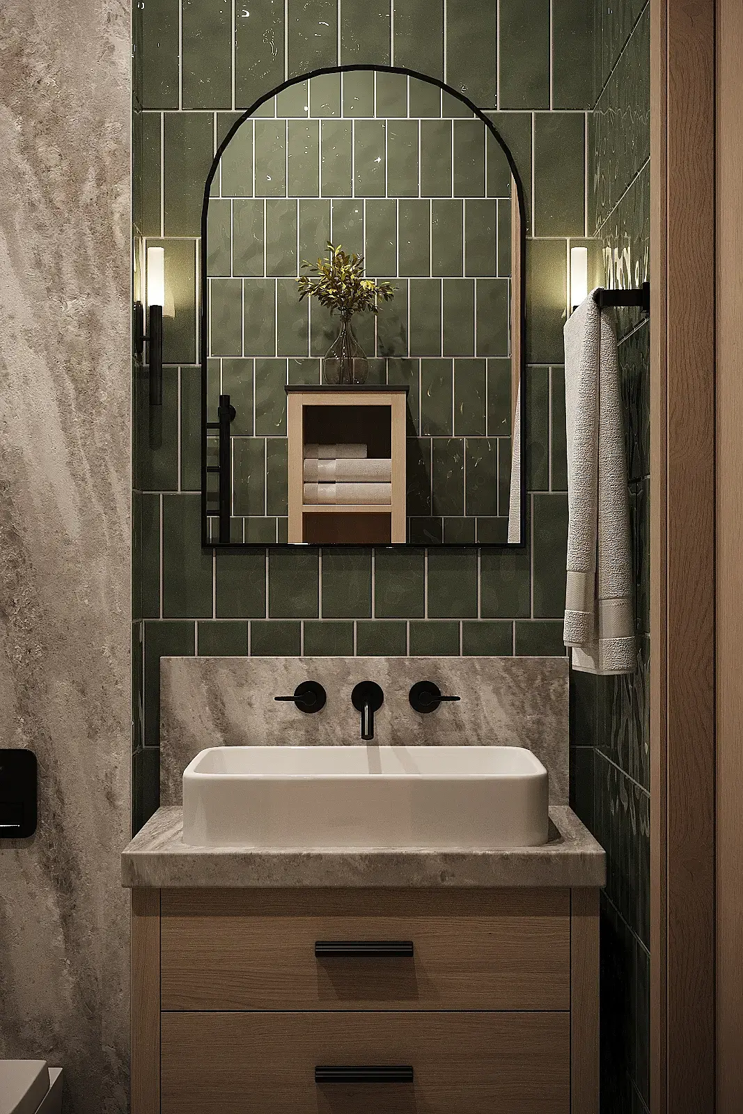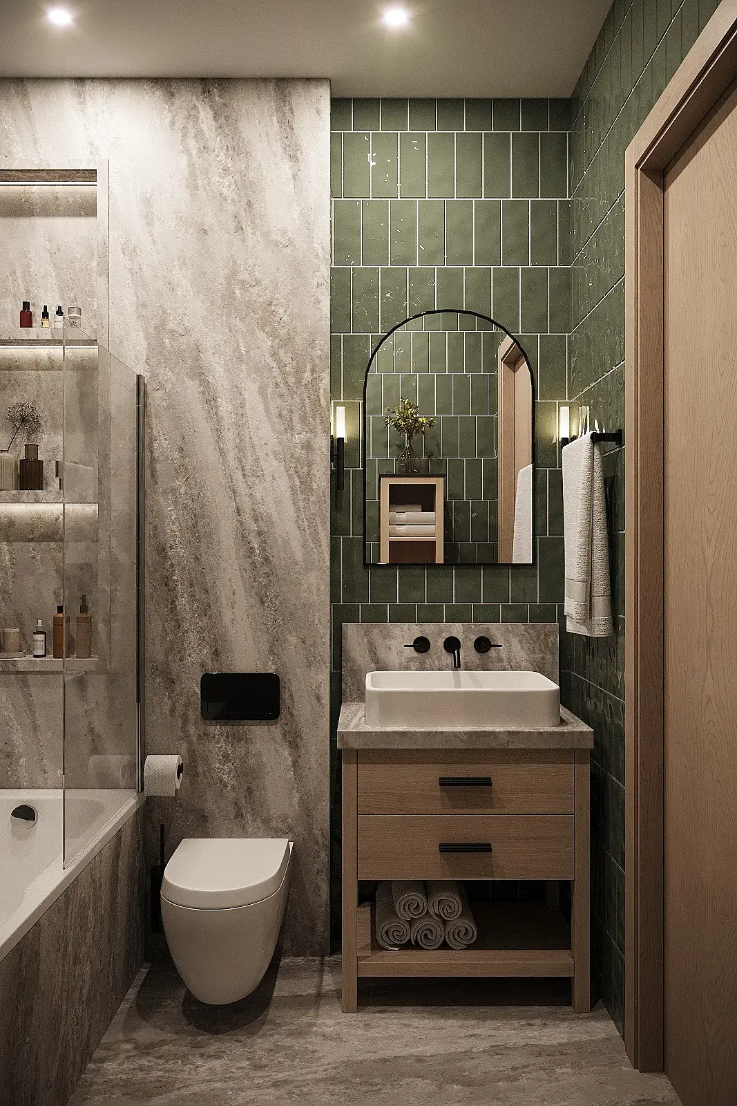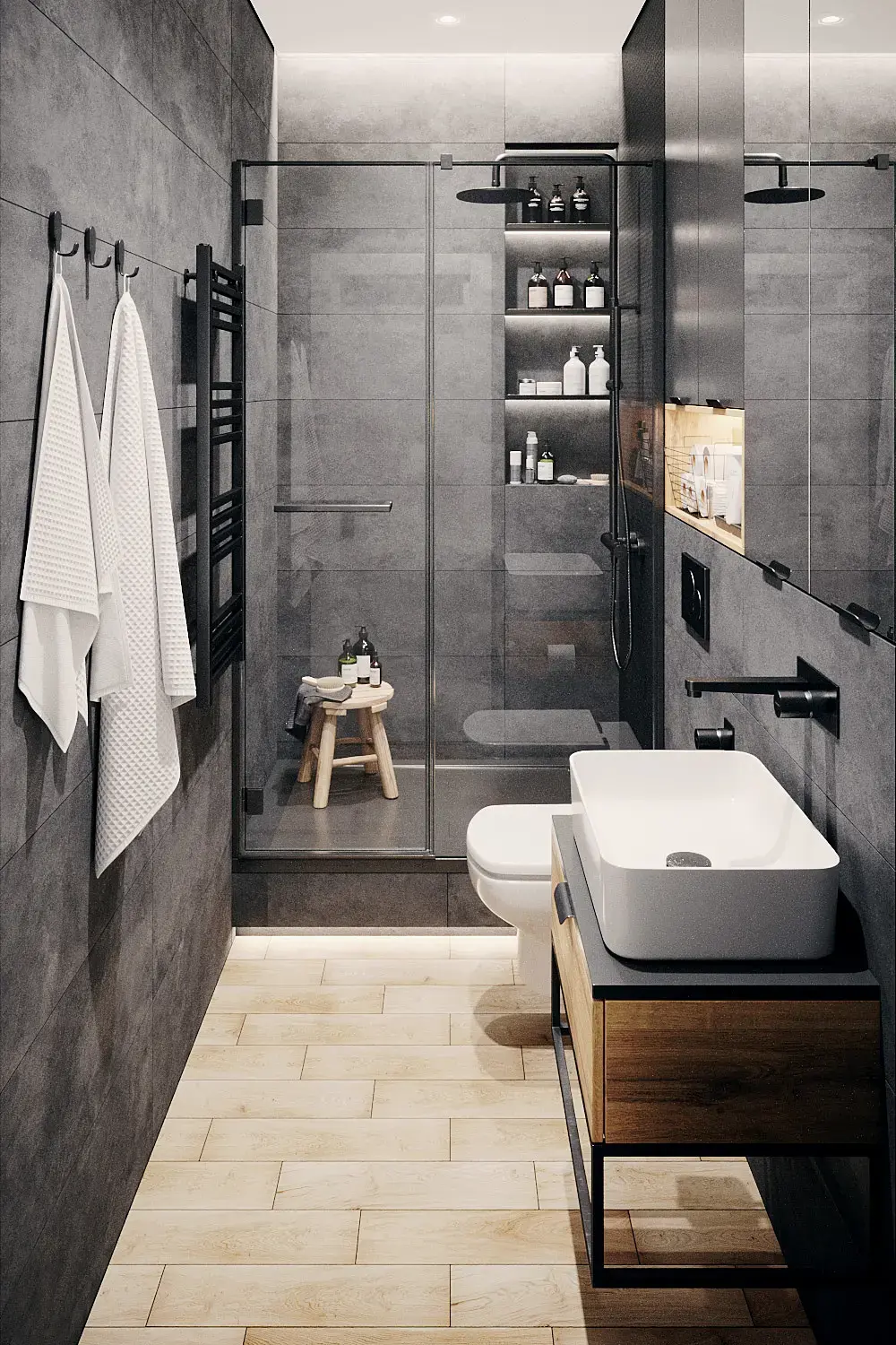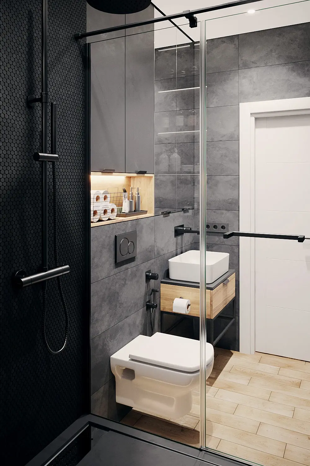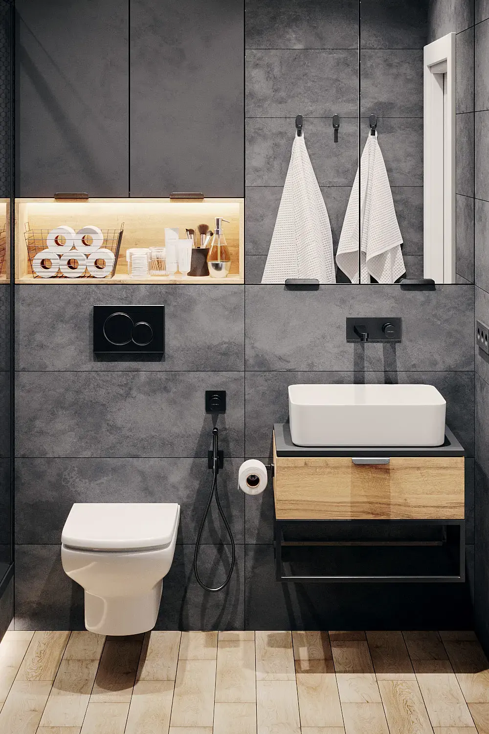 Интересный вопрос... Я привыкла что это всё снаружи санузла. По-современному должны быть дублирующие выключатели тогда? Вытяжку я кстати вообще тут не моделила... должна быть где-то над полками в душевой...