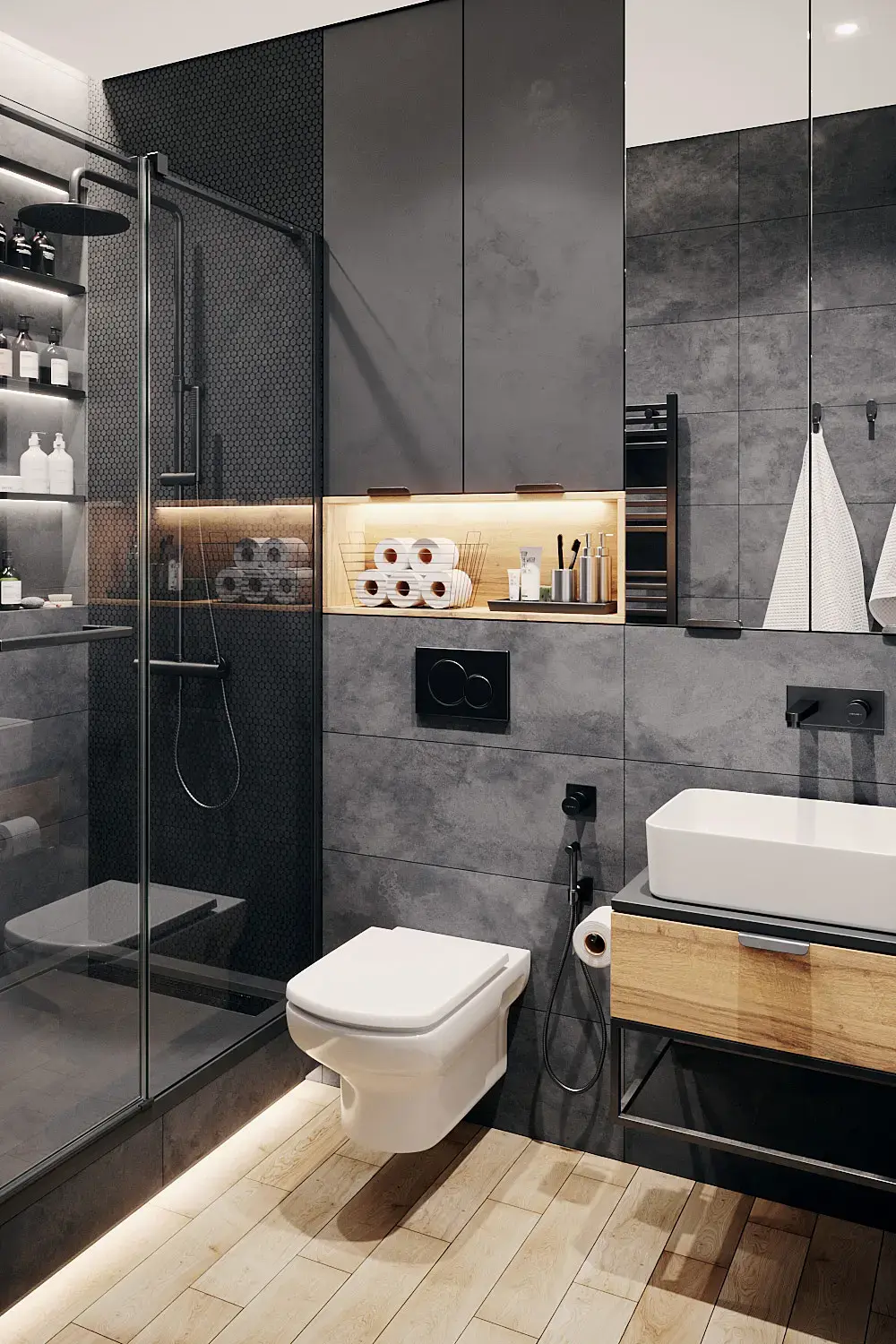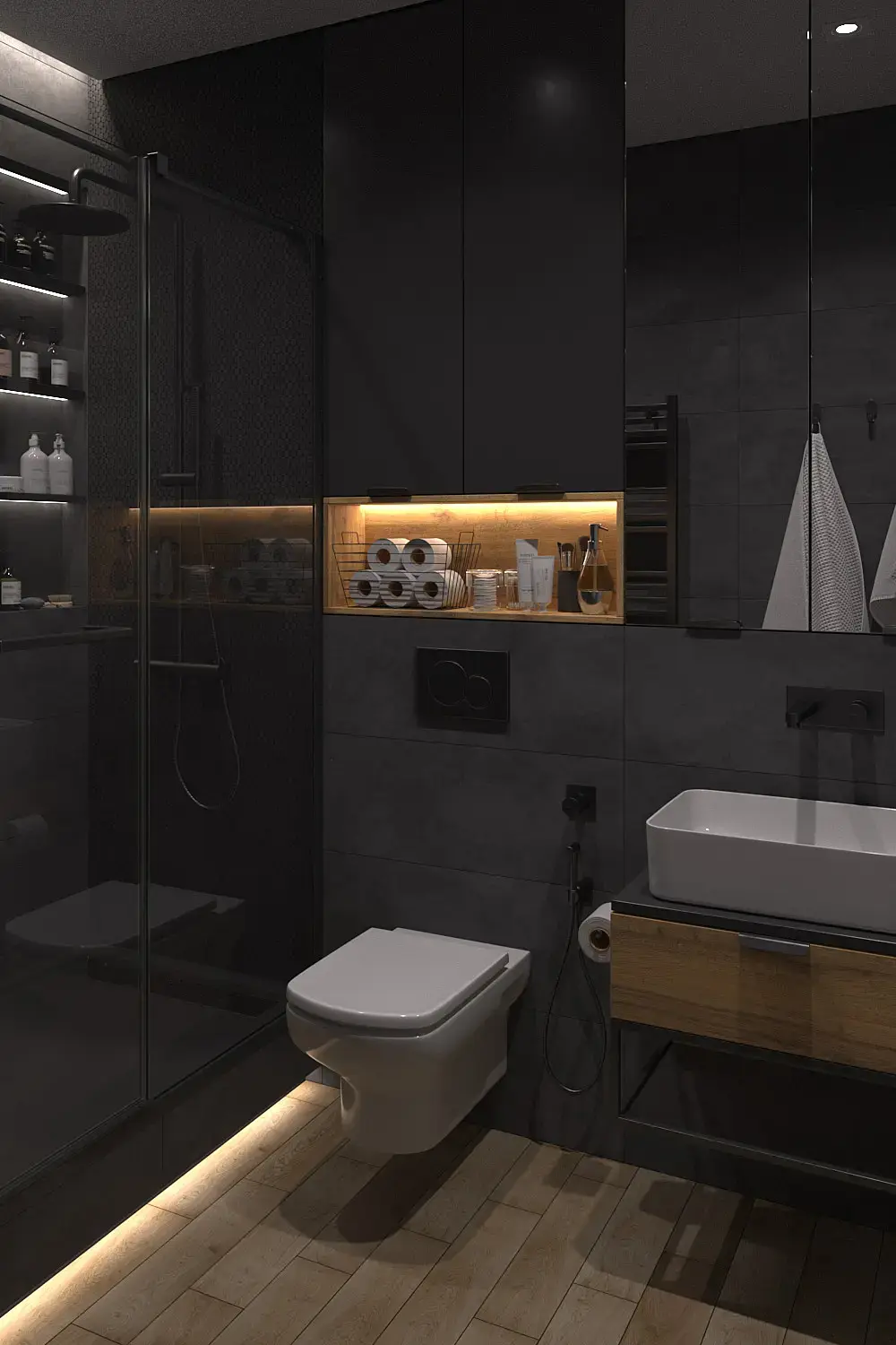 Подсветка в нише с полками в душевой - тоже пойдет только на пользу визу.