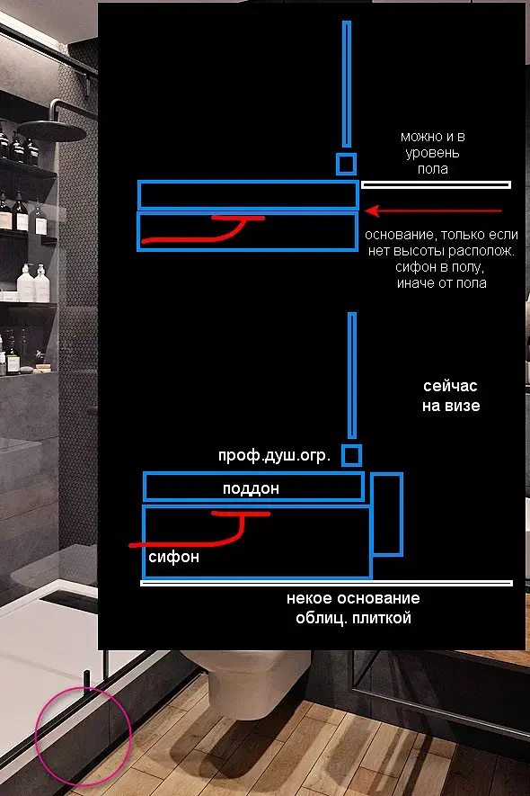 Поддон душевой тоже в плитку и трап Уже и ближе к стене на всю ширину. Можно в стену встроенный