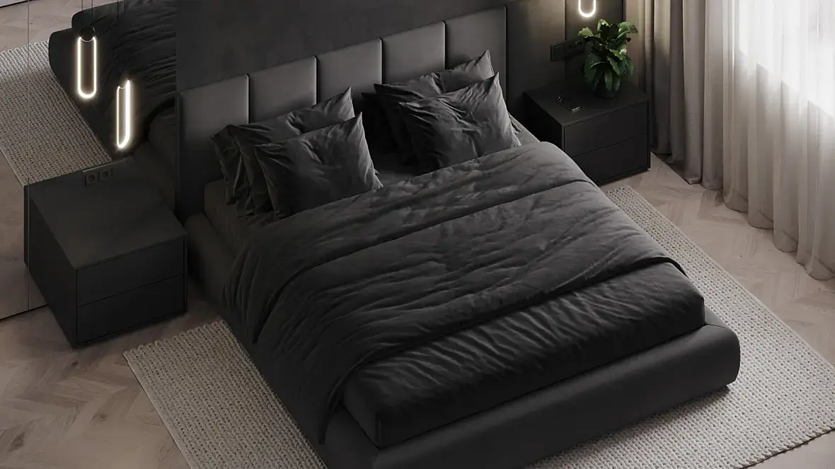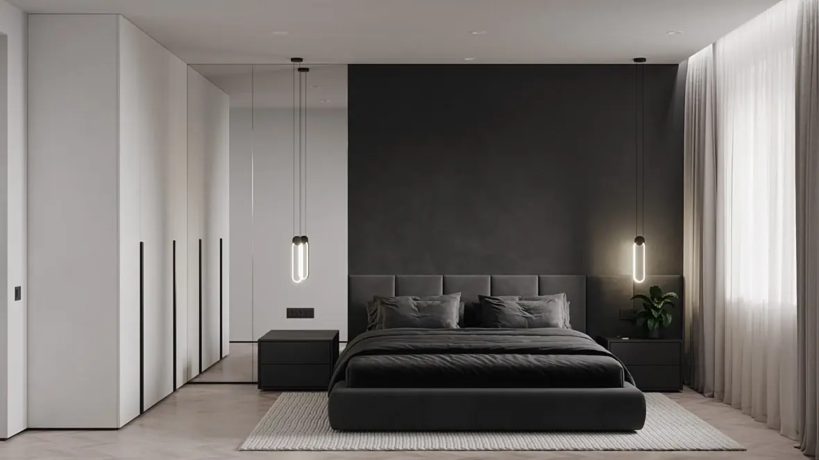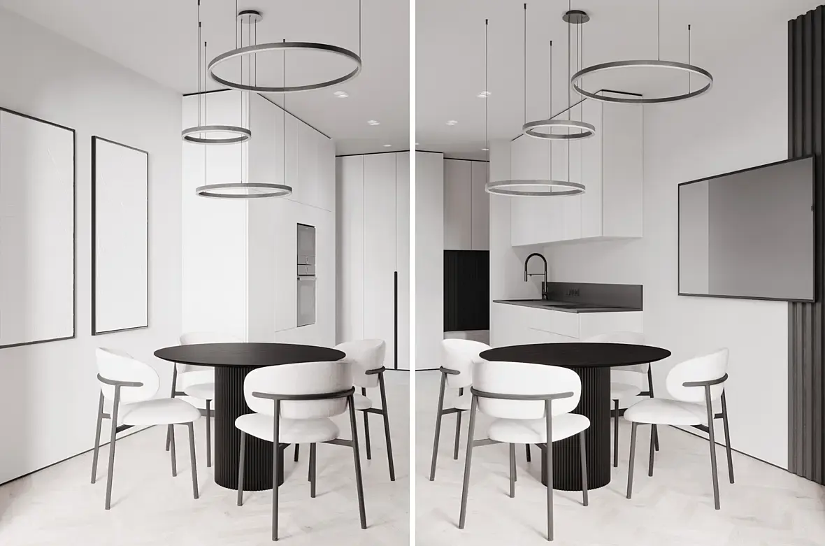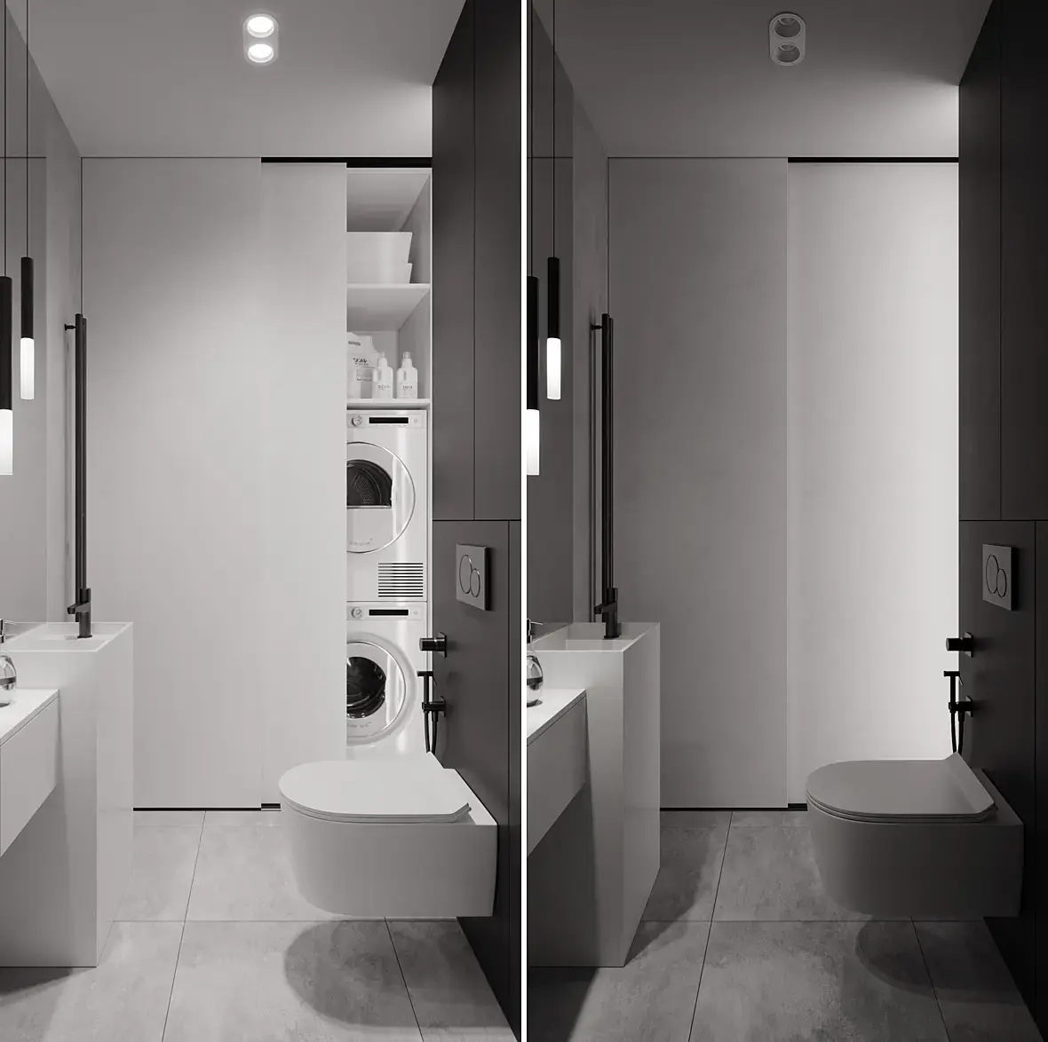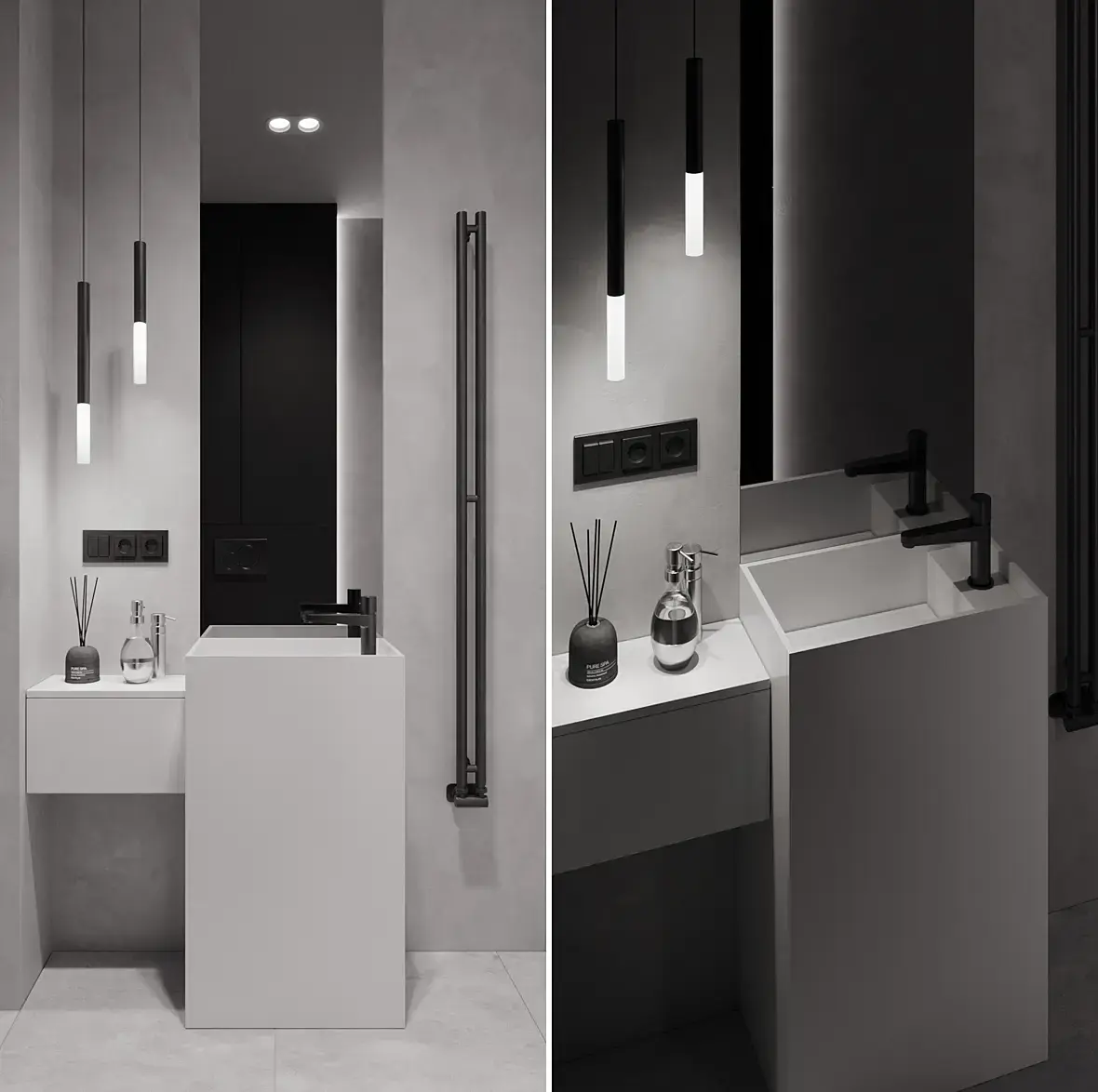 В остальном ничего не напрягает, ни борьба черного с белым, ни асимметрия. Ну разве что черная тумбочка слева у зеркала будто вышла за границы своей зоны. Возможно лучше там было белую поставить. Но это не точно ) А так все вполне себе гармонично, на мой вкус.