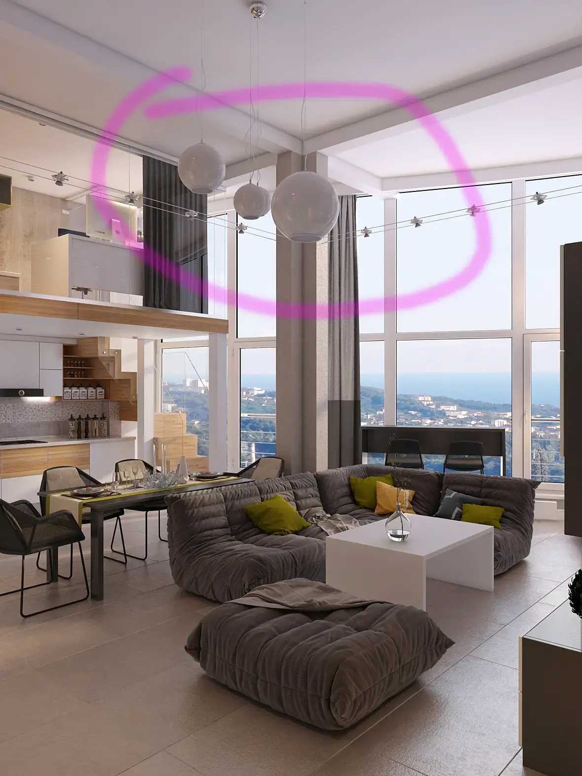 по кухне не нравится подвесной над столом, он гораздо больше диаметра стола, какои нибудь небольшой одинарный возможно был бы поаккуратнее. Не нравиться варочная по центру ящиков, и узкие верхние дверцы. но это мелочи. в целом "сомнительно, но ок" )