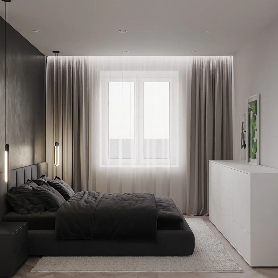 Невероятно большой комод, очень все портит. Встроенные точки в потолке тоже надо убрать. В остальном все классно. ) ну и материал тюли надо совсем слегка прозрачный.