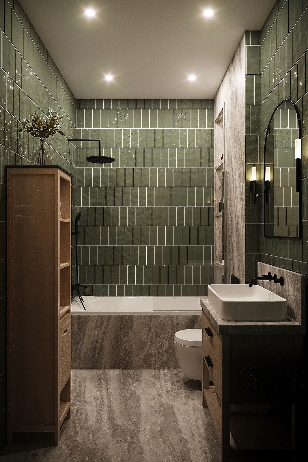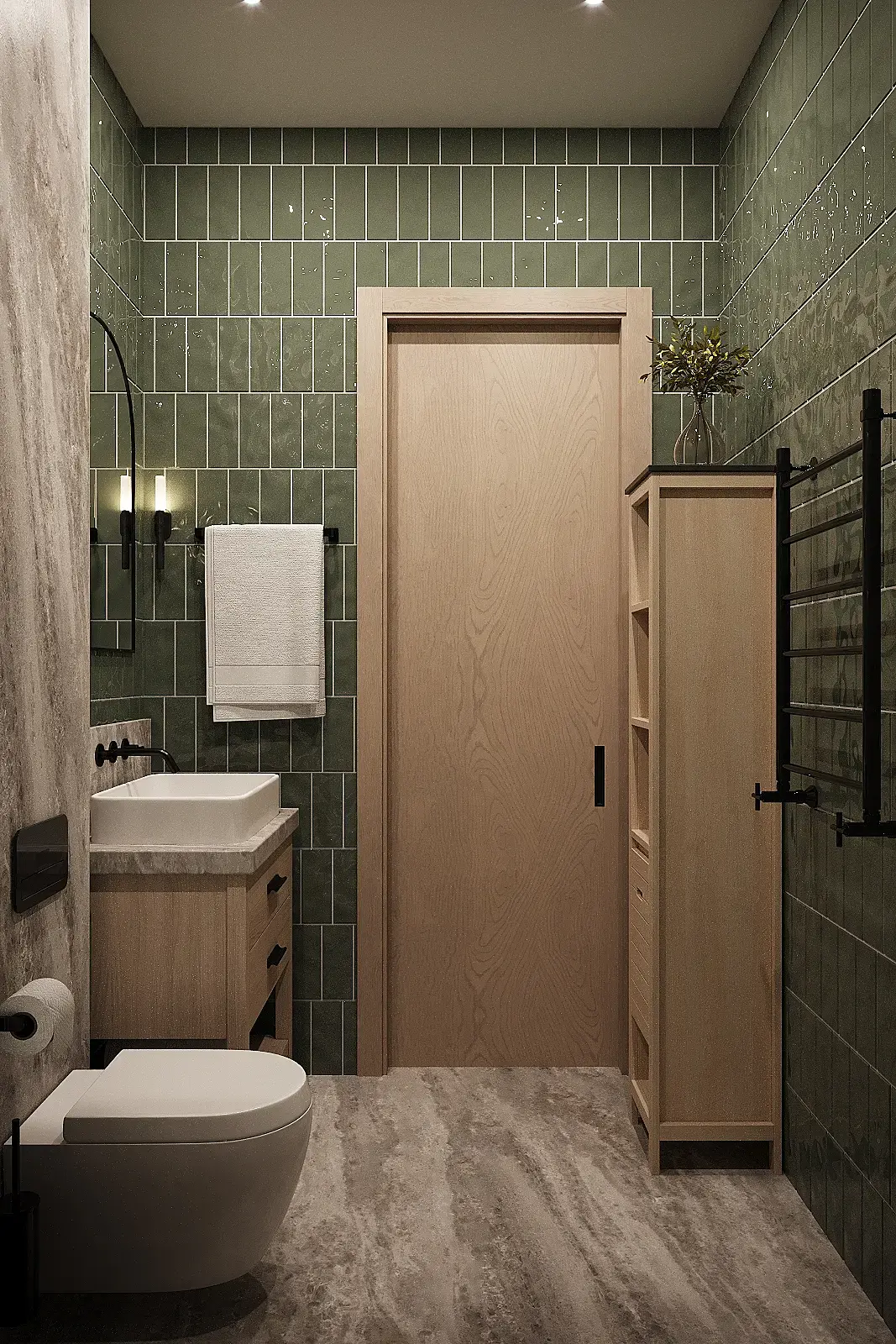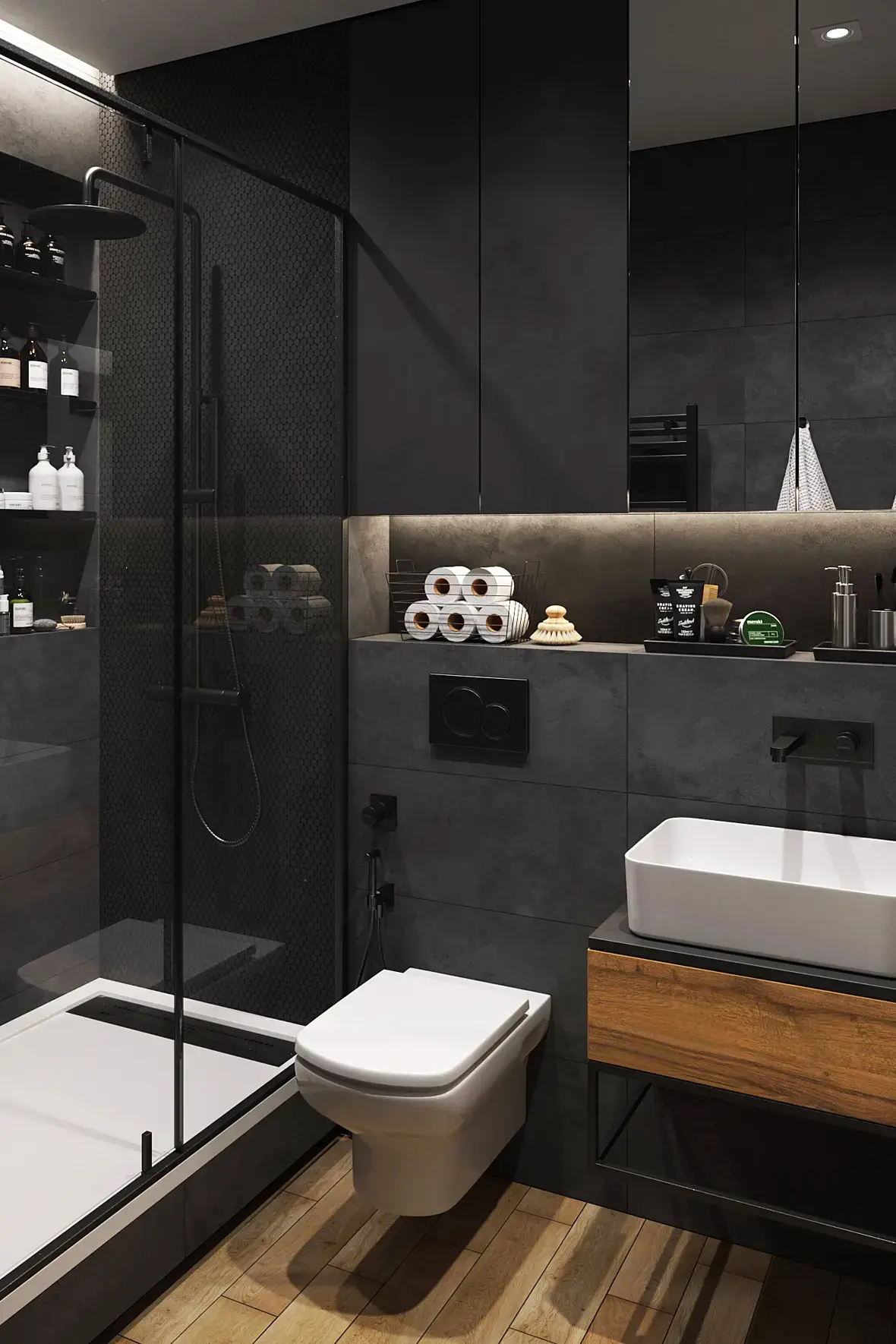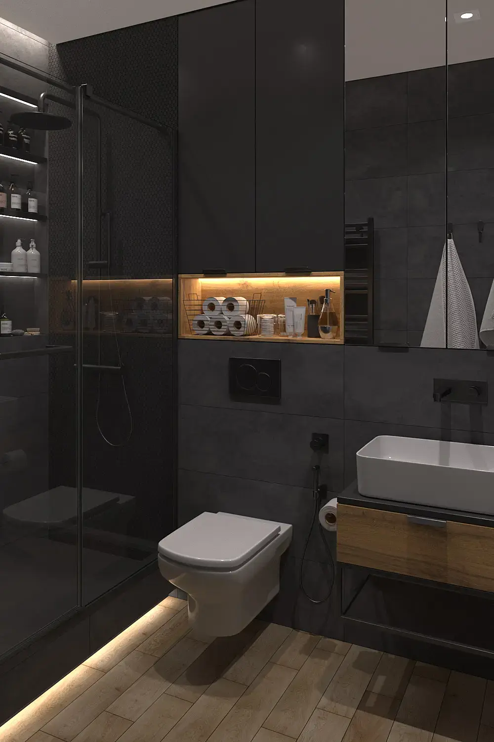 Интересный вопрос... Я привыкла что это всё снаружи санузла. По-современному должны быть дублирующие выключатели тогда? Вытяжку я кстати вообще тут не моделила... должна быть где-то над полками в душевой...