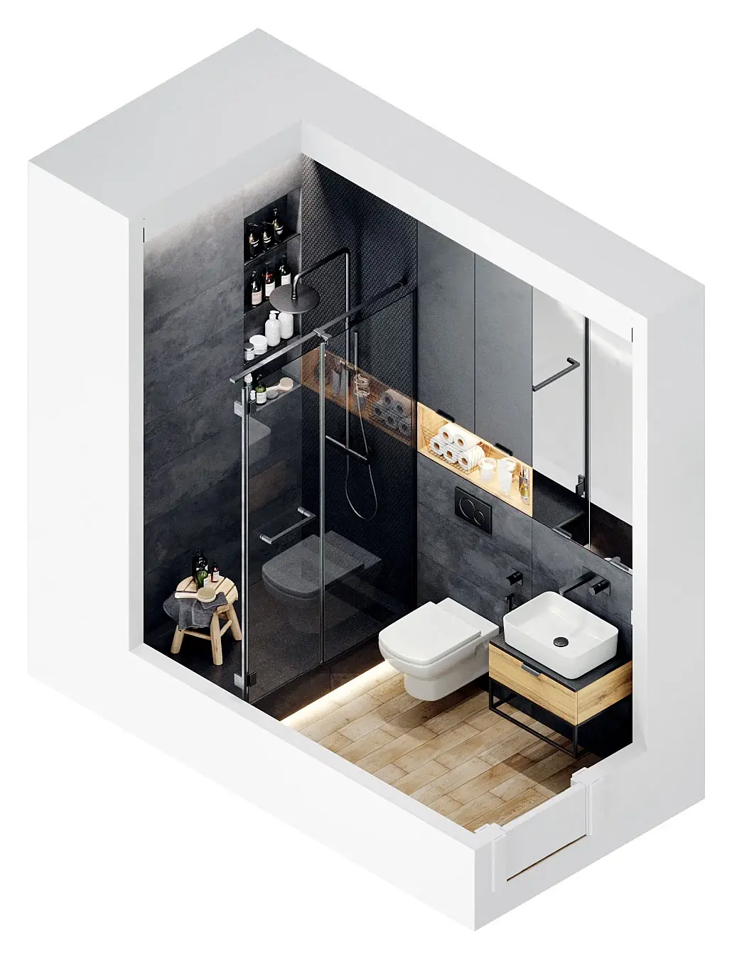 Сифон предположим можно поставить чёрный. Но у большинства сантехники встроенные детальки в хроме (тот же перелив, форсунки гидромассажа, петли унитаза, щелевые сливы у готовых душевых поддонов и т.д.). И тут 3 варианта: подбирать сантехнику только с чёрным или белым / перекрашивать хром в чёрный только на рендере / забить и миксовать чёрный с хромом.