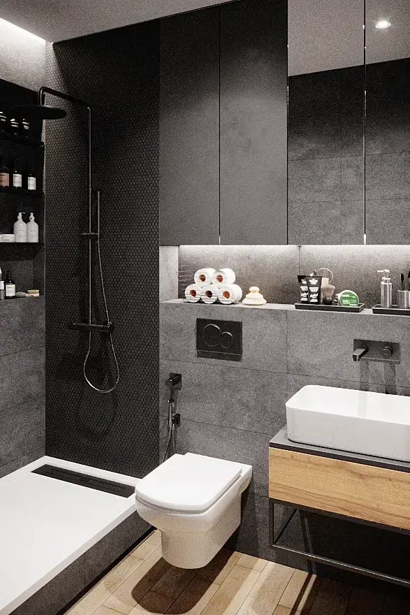Что меня смущает: 1) слишком резкие тени от предметов и мрак в нише душевой 2) тёмный потолок (вроде физически корректно, но вспоминаются обсуждения правок от заказчиков "почему потолок не белый?") 3) нужен ли RaySwitch для зеркал и стеклянной перегородки?