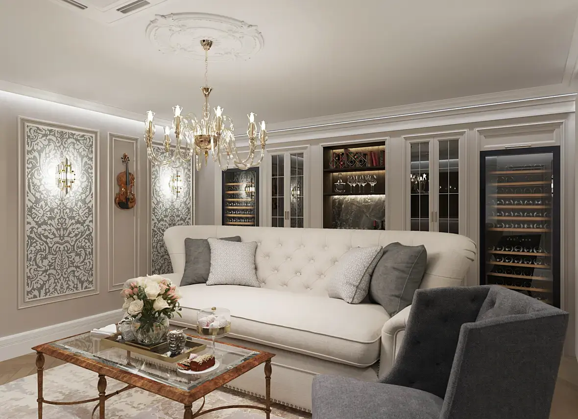 Пропорции мебели явно не соблюдены. Диван и кресло рядом, а высота сидения значительно различаются. Обычная высота 450-500 мм. Высота спинки дивана чуть ли не до середины высоты стен. Сядешь на диван и упрёшься головой в люстру.