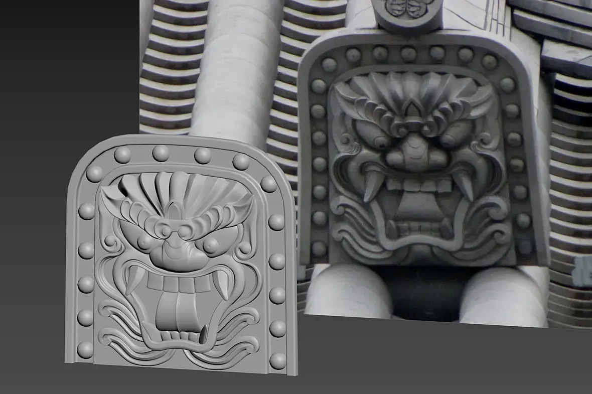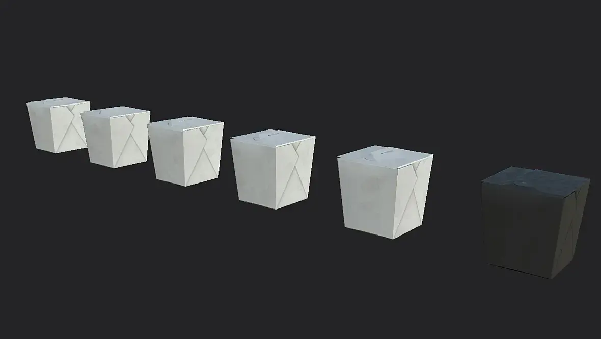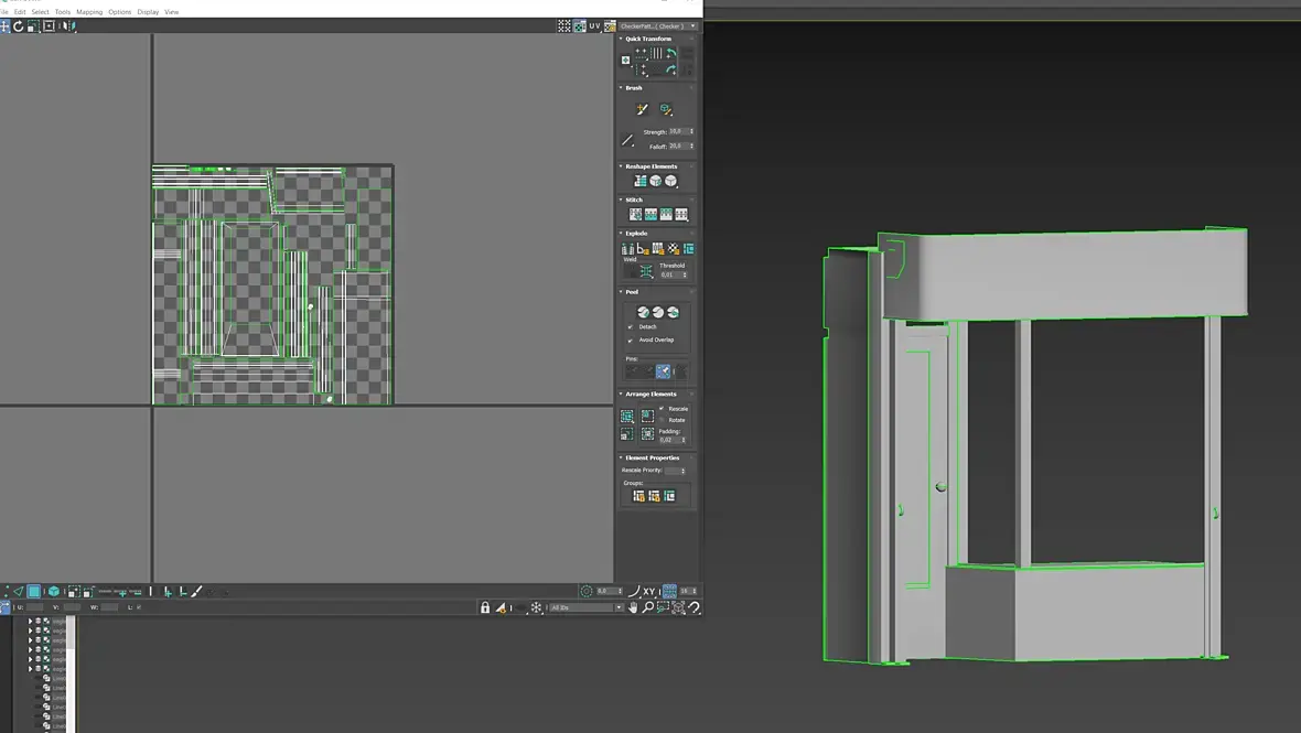 Потом сделал развертку для всех объектов.Но наверное стоило сделать плитку односторонней,ведь все эти тайлы занимают слишком много места на развертке.Но хотел сделать так,что можно будет удалить некоторые элементы(как будто они отвалились)Поэтому еще добавил рейки к каким по логике эти тайлы должны прибиваться.В процессе еще узнал,что нельзя делать развертку на объектах,какие в инстансе скопированны(развертка слетает)Затекстурил,там все довольно просто,сделал только 2 варианта с мхом и без.С деревом как всегда проблемы,не могу найти золотую середину между стертостью и четкостью паттерна.Хотел сделать что-то похожее на это.