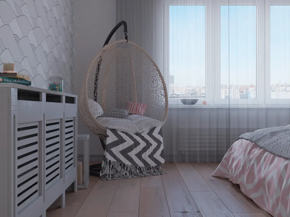 уверен , референсом был не каталожный кадр подвесного кресла, а один кадр из фотографий (надеюсь не рендеров) спальни. Фотограф просто как смог сфоткал это кресло, как поместился. Референс я не видел , но если вы его повторили близко по композиции, то фотограф сработал очень так себе. Камера очень низко, кресло объективно не в центре композиции. Этот кадр просто не может быть крутым) (как бы мне не хотелось выступать в роли цензора того что круто , а что нет, но тут по-моему довольно однозначно) можем поспорить)) Возможно если бы это была подборка из 5-7ми фотографий спальни то и ладно, для понимания объема помещения норм. Но как один ракурс на подвесное кресло , это неудачная композиция. Так кресло не продать) . Хочется кадр сделать вертикальным, так возможно попасть в композицию будет проще. Лишне (плохая модель комода с странным мапингом дерева) обрезать сильнее. и кресло как то слишком влипает в комод в кадре. отодвинуть бы немного или повернуть камеру. надо пробовать)