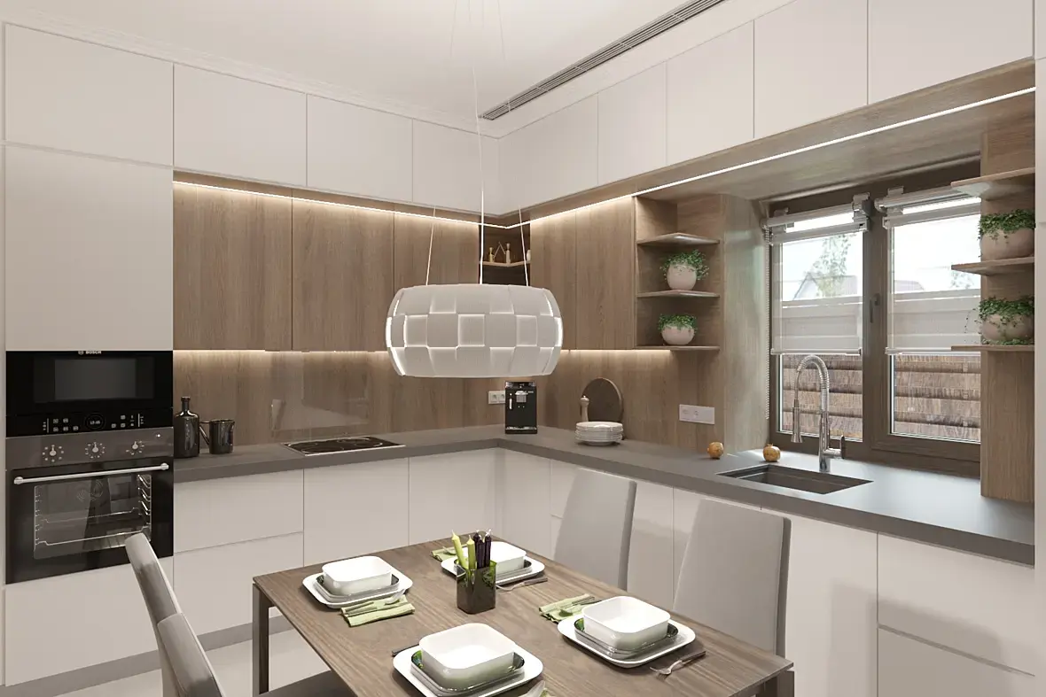 Но клиентам захотелось изменить стилистику кухни на более современную, освещение, розетки, выключатели потолок и пол уже все сделали... теперь кухня выглядит по другому.