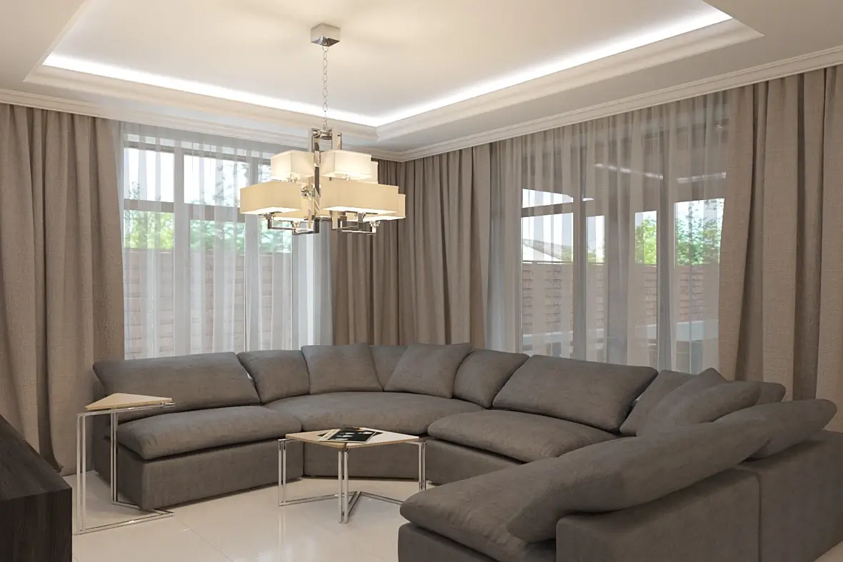 как-то зажато все, на камере можно уменьшить фокал ленз. Ракурс на диван - камеру чуть ниже бы(меньше потолка - больше дивана). Можно попробовать добавить красок: дневной свет - холодный, искусственный - теплый(также не стоит забывать что дневной свет намного ярче чем искусственный в реале). За окном слишком ядреный фон, текстура ткани на шторах великовата и стежки на диване лучше в тон сделать.