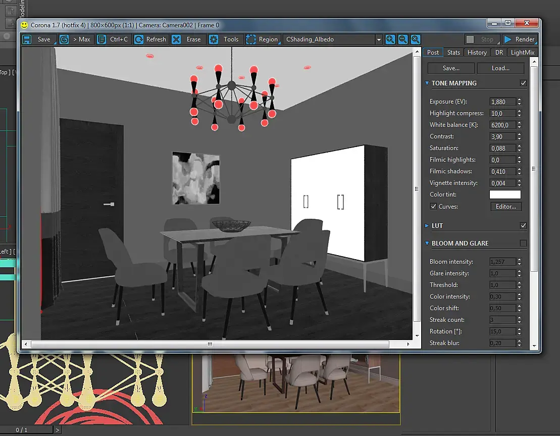 Эти красные пятна на пассе альбедо говорят о неправильно настроенном дифузе материала. Возьмите материал плафонов и в дифузе поставьте значение белого цвета на 205 максимум. У потолочных светильников так же. Такие элементы тормозят просчёт и рендерятся часто с артефактами.)