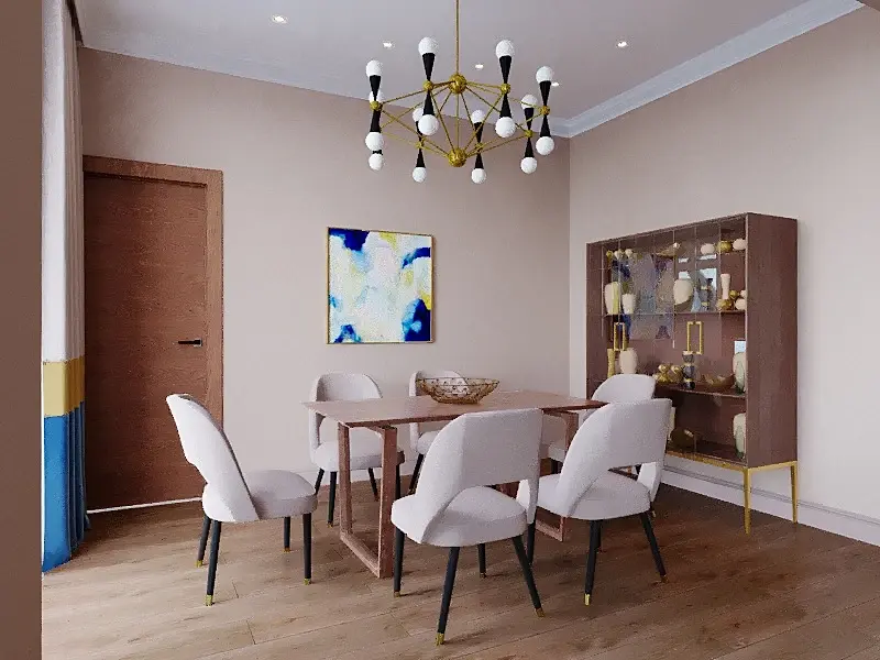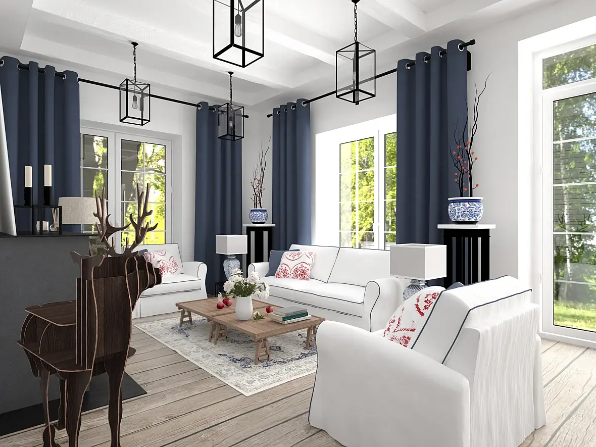 Мне, почему-то кажется, что складки штор слишком массивные и их мало. Они могут не сомкнуться если их растянуть. Люрексы проверьте по размеру. Алая вышиванка на подушках, не вписывается. Белые кресла попадают по цвету и тону в стены. Про материалы, вам уже сказали.