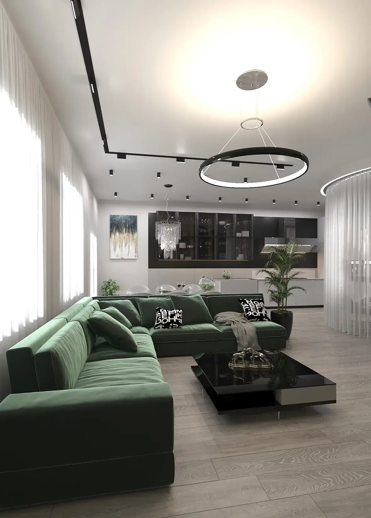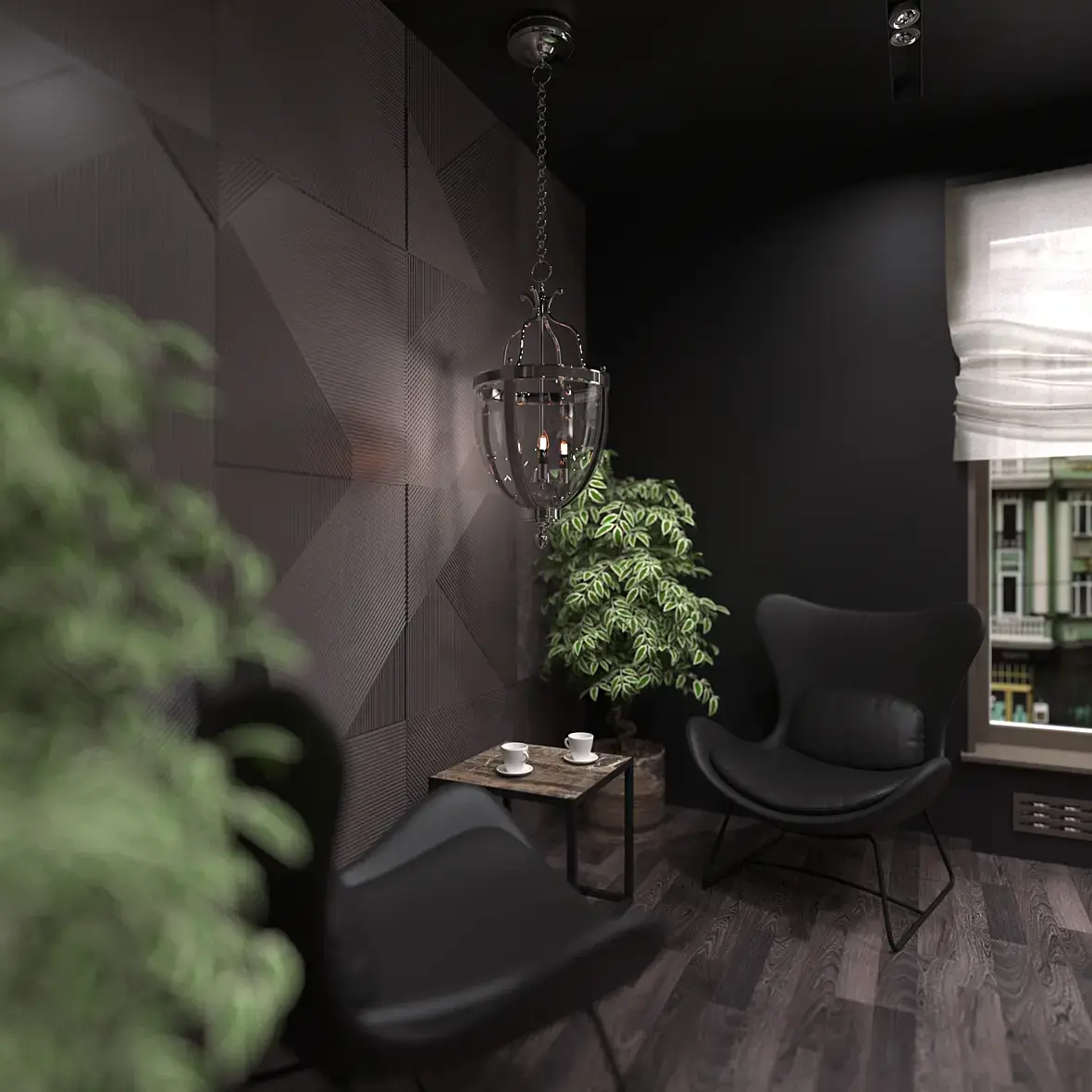 Лично я считаю, что композицию можно было бы чуть изменить так, чтобы в кадре было понятно куда и на что нужно смотреть. Много на себя берут растения, я бы в два раза меньше пространства им выделил на картинке. И потолка тоже многовато. Кадр с тв "заперпендикулярил" бы со стеной, так было бы интересней на мой взгляд. А виз хороший получился.