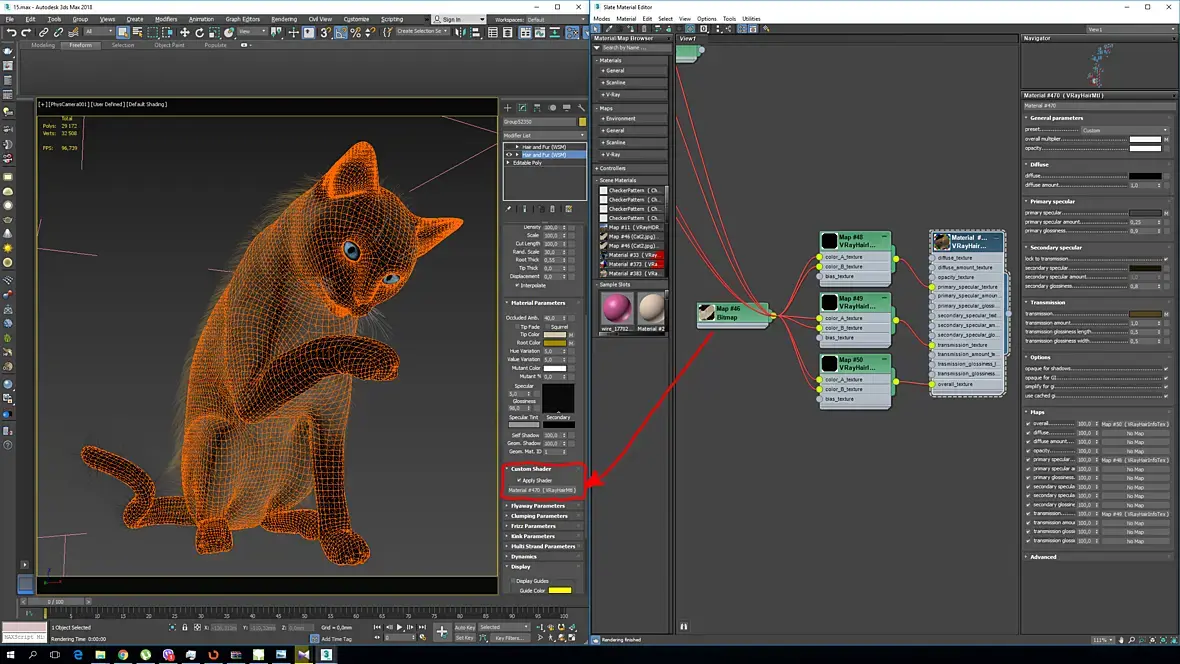Доброго времени, решил сделать модель кота и поработать с Hair and fur/VrayHairMtl, но столкнулся с проблемой. Когда пытаюсь назначить материал VrayHairMtl с текстурой шерсти в Hair and Fur