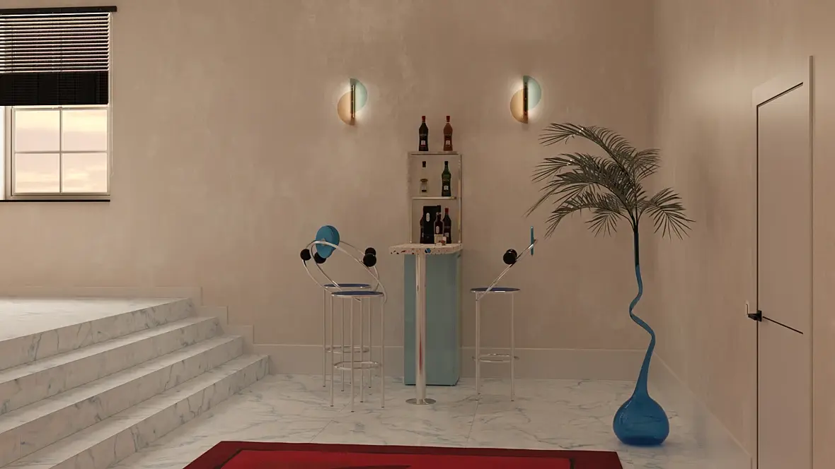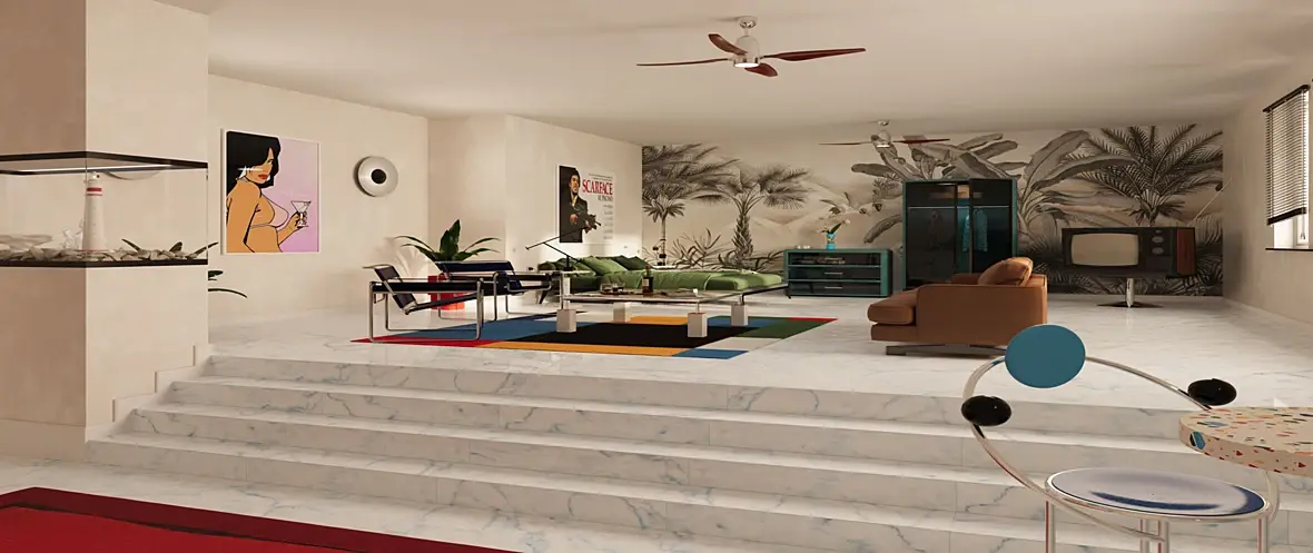 Полиция Майами, Лицо со Шрамом(особняк Версетти как раз). В первом(сериал), можно увидеть мельком интерьеры и ощутить этот вайб, майами 80-ых, но затянуто немного. Если есть интерес, можно пару-тройку серий посмотреть. Рендер запустил, минут через 10-15 покажу "обратную сторону".