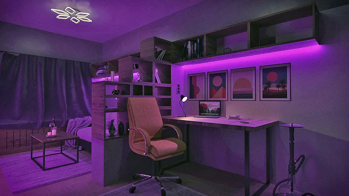 Автор делал наверное ощущение уютной тёмной пещерки. Сделать бы меняющиеся или переливающиеся радугой цвета, будет веселее и лучше осматриваться помещение. Всё что не может разглядеть человек, вызывает чувство страха у смотрящего. В фильмах ужасов это постоянно используется