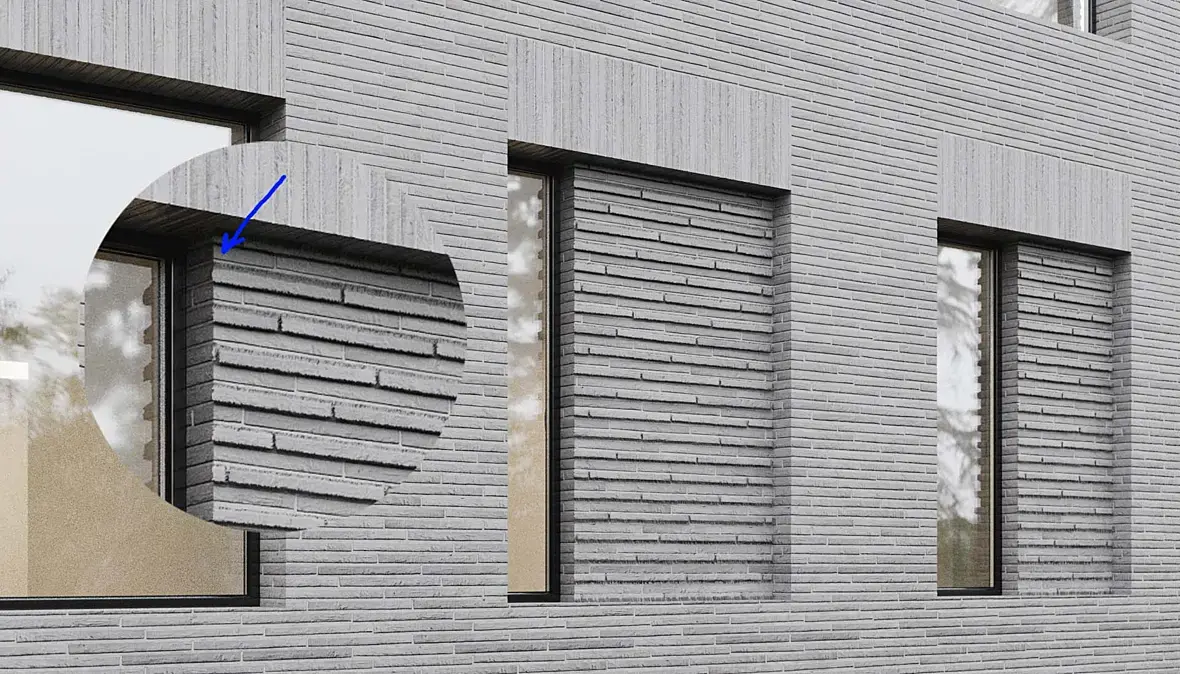 Принял решение перемоделить коробку заново, результат оправдал ожидания.Материал кладки сделан дисплейсом (актуальный материал на первых картинках в шапке) затем пришло тз на вертикальную кладку над оконными проемами, и объемную кладку в оконных проемах. Нарисовал к текстуре кирпича 2 дисплейс карты, выдавил и мне не нравится результат..