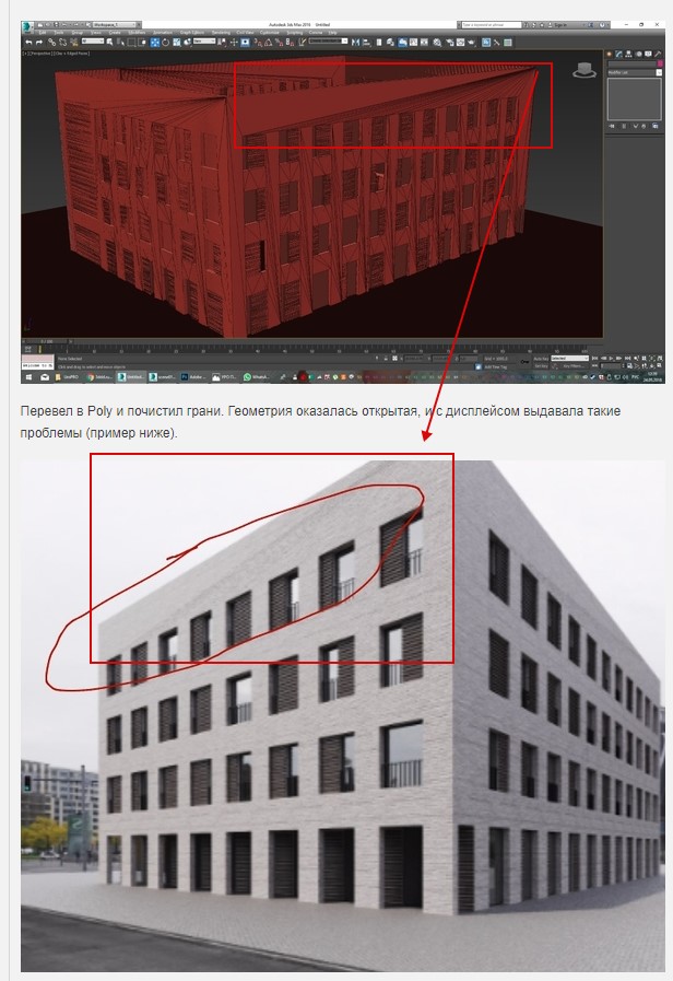 Столкнулся таки с визуализацией фасада, опыта не много, поэтому решил сделать вип. У меня вопросы к профи, верю что не пройдете мимо и поможете.Есть фасад, и есть проблема, точнее недостаток.. Заказчик его принимает, но мне самому хотелось бы сделать все правильно. Речь идет о кирпичной кладке (остальные проблемы обсудим чуть позже). Я получил коробку от дизайнера в формате FBX сделанную в Sketchup, пример ниже.
