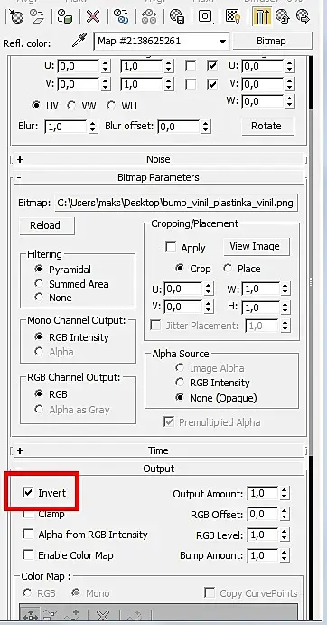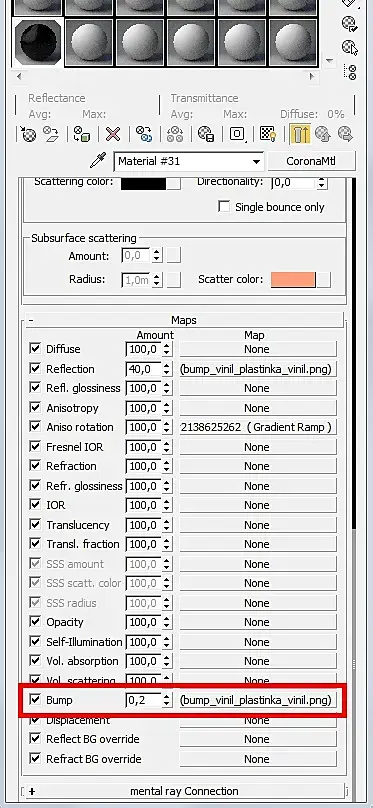 Далее берем обычный стандартный CoronaMtl диффуз выставляем полностью черный, level 0.8? настраиваем ему отражения как у обычного глянцевого пластика. В слот Reflection Color кидаем нашу карту бампа винила, не забыв внутри карты включить галочку инверт.