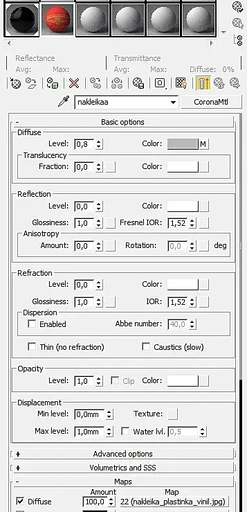 Материал наклейки очень простой, Полностью матовый CoronaMtl В диффуз колор кидаем нашу подготовленную красную карту. Диффуз левел выставляем 0,8.
