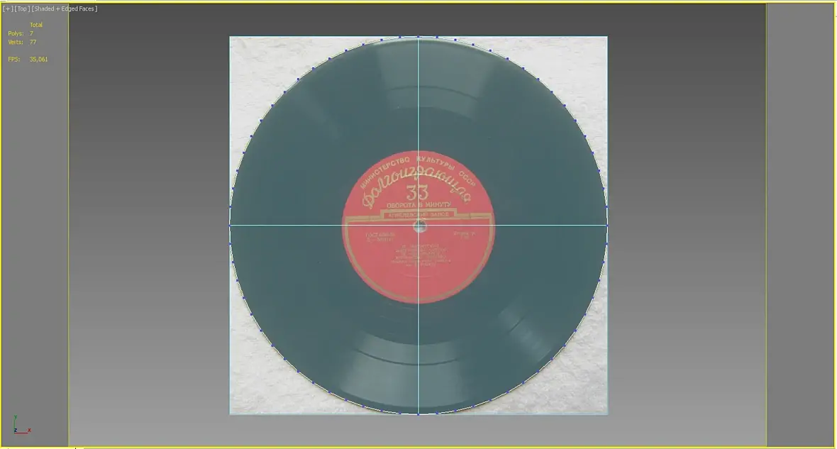 Создаем плоскость с 64 гранями (количество граней важно для последующего сглаживания модели). В настройках делаем её полупрозрачной, нам важно видеть под нашей геометрией наш план с текстурой пластинки.