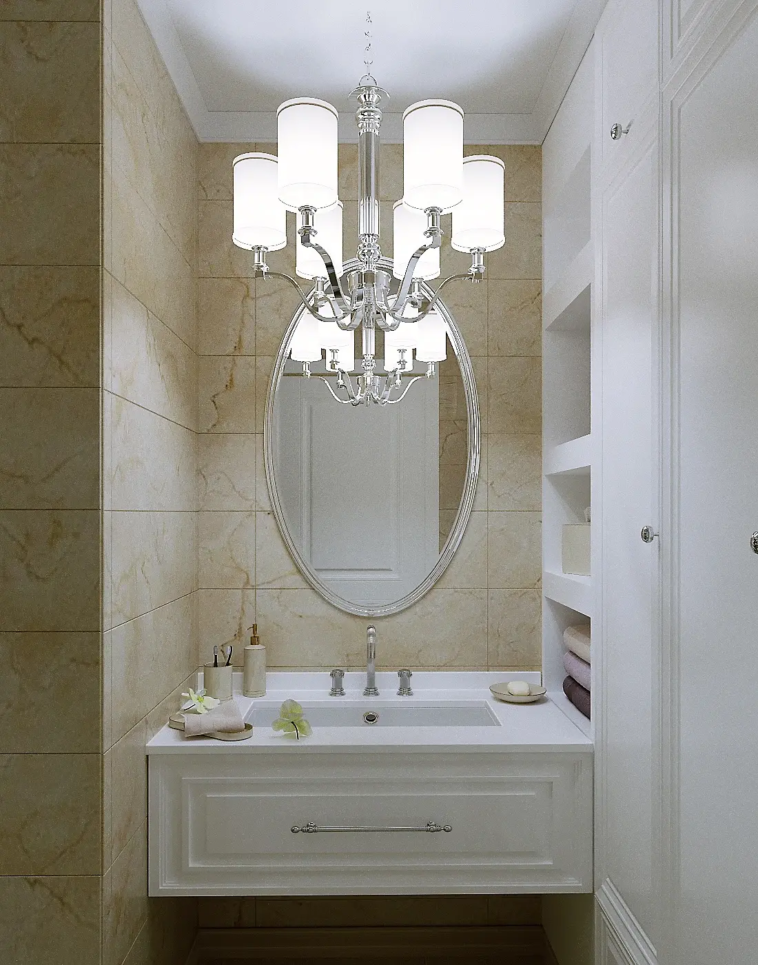 Как человек будет через люстру дотягиваться к полочке справа?