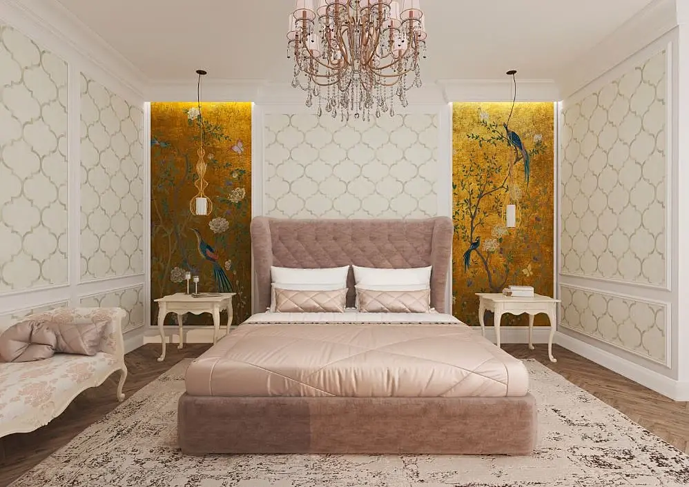 освещение. очень тускло, невыразительно, кажется что воздуха нехватает в комнате. есть артефакты на полу, светильниках и изголовье. материалы невыразительные. люстру вообще лучше не включать при дневном освещении. модель штор изящнее возьмите.