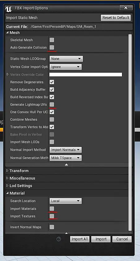 Всё это экспортировалось с перезаписью файла SM_Room.fbx И в анриле обновляю файл, нажав reimport.