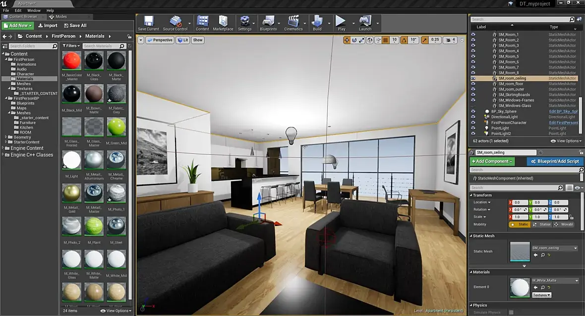 Я немного отклонился от действий урока. Там помещение – это одна меш. Если создать ей коллизию в UE, то внутрь мы уже не попадём в режиме PLAY.