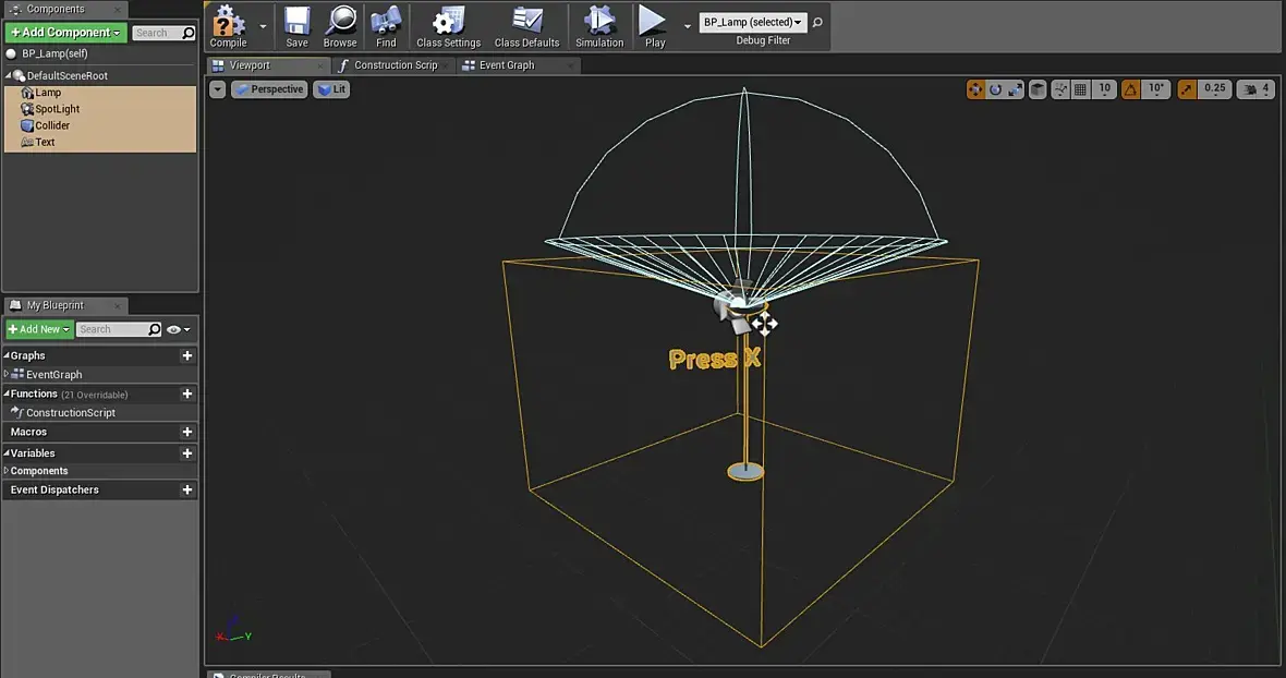 Получилось, только надпись Press X видна в момент пересечения коллайдера лампы. А должна быть видна постоянно, когда я нахожусь внутри. И материал торшер не видит