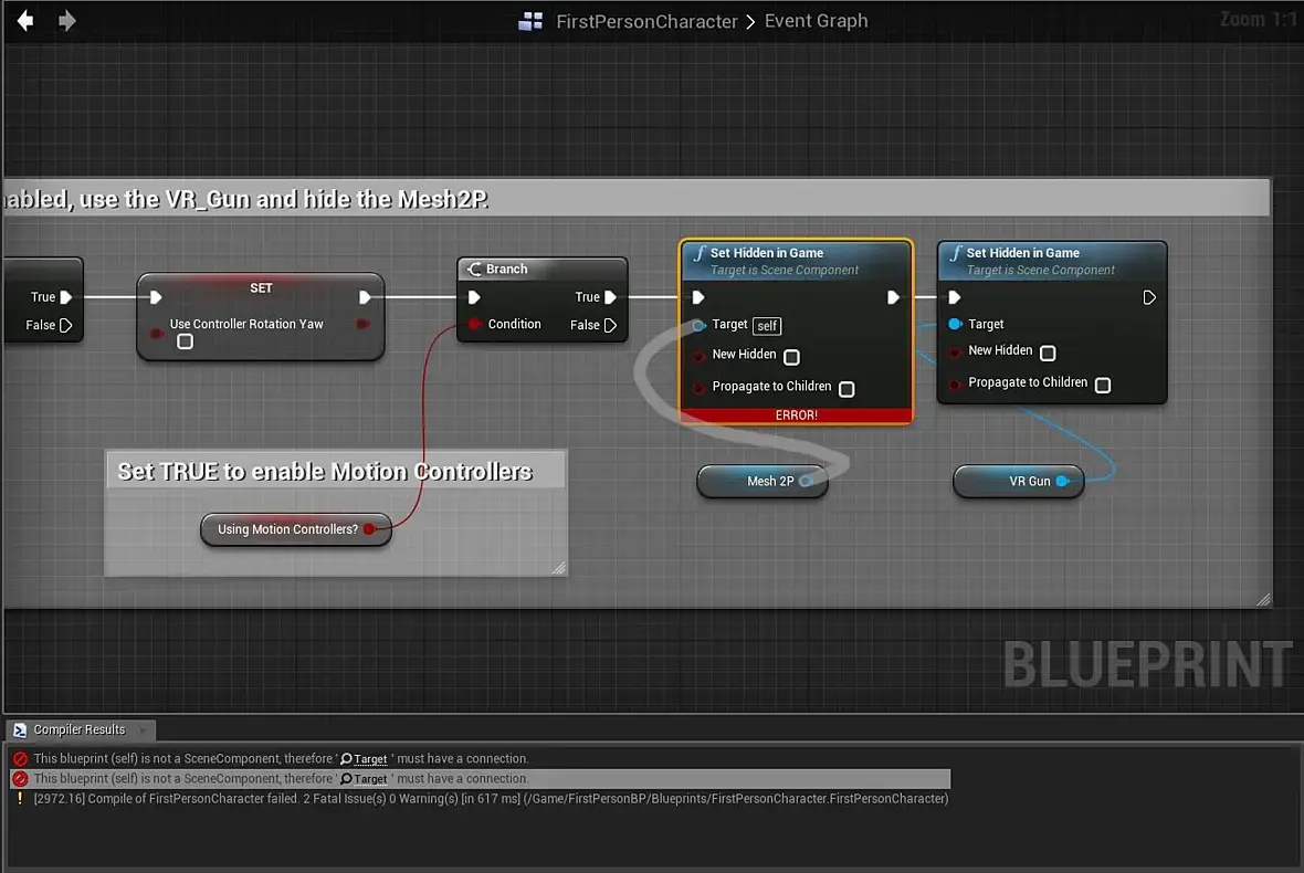Потом при сохранении актора ошибки вылезут. Нужно будет удатлить все блупринты, которые красным подсвечены и еще раз скомпилить и сохранить. Еще нужно будет перекрестие красное убрать в виджете.