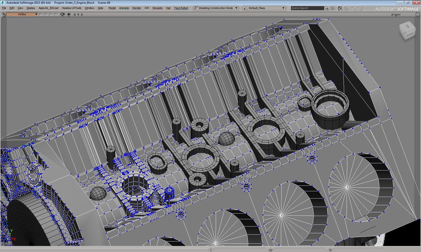 Я б общий полигонаж исходной сетки снижал. Все же постараться чтобы самые большие дырки (цилиндры) были восьмиугольниками в исходнике а остальные 4 или на край 6-ти. И доныщки в них не нужны понятно. И в идеале бы сделать "как в жизни" - чтоб в блоке гильзы стояли.