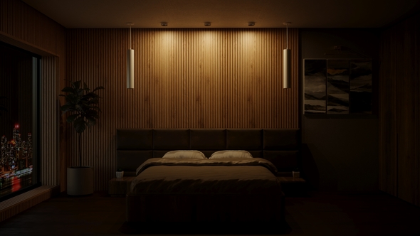 Ну в данном случае не надо было плейн с задником ставить параллельно оконному проему, а скорее всего поставить перпендикулярно камере, ну может покрутить мальца, чтоб визуально смотрелось нормально, а то сейчас фон деформипровался. Ну а если заморочиться чутка, то можно на боксы накинуть самосветящейся мат с текстурой фасада ночного, но тут это лишнее конечно. Просто плейн поверните.
