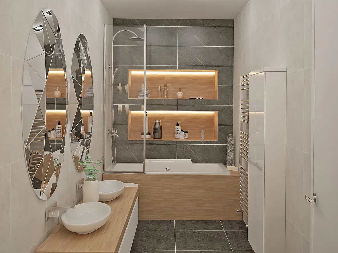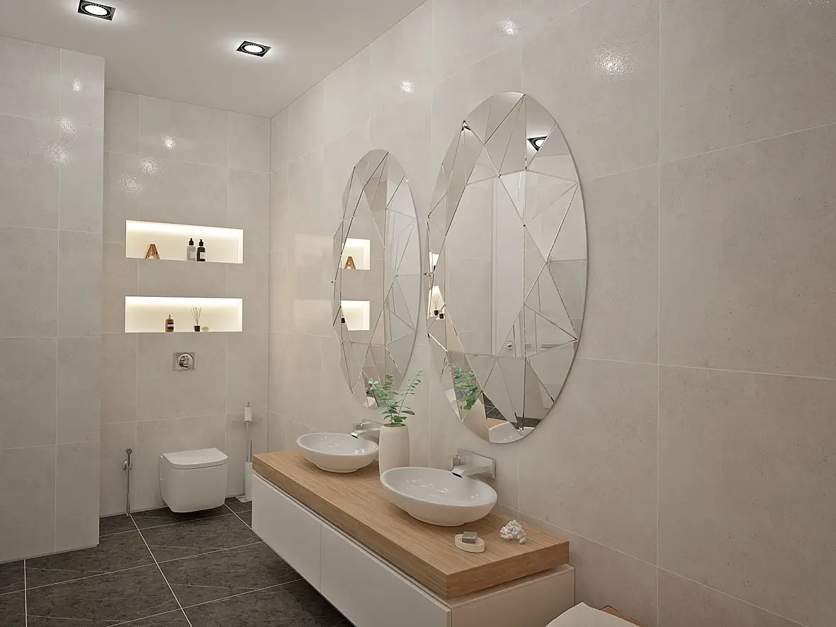| по ванной. невнятный свет."Точки" так не светят - ни вокруг себя , ни на пол. столешница отходит от стены .Смесители тоже. серую плитку ,возможно,хотя бы покрутить надо, чтобы уйти от тайлинга. "цветок" совсем плох. по дизайну-эргономике.Не соразмерные зеркала для такого помещения."подсветили" всё , кроме места перед зеркалом. |