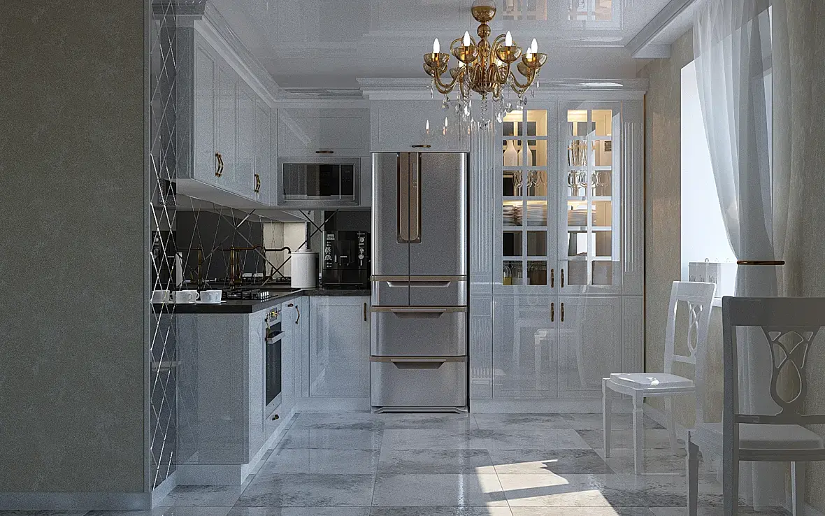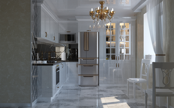 | Цитата 7083: выглядит так, будто хозяева заехали, но стол еще не привезли. Современный холодильник с такой кухней смотрится странно. Заказчица решила оставить люстру и холодильник. А стол действительно еще не купили.
