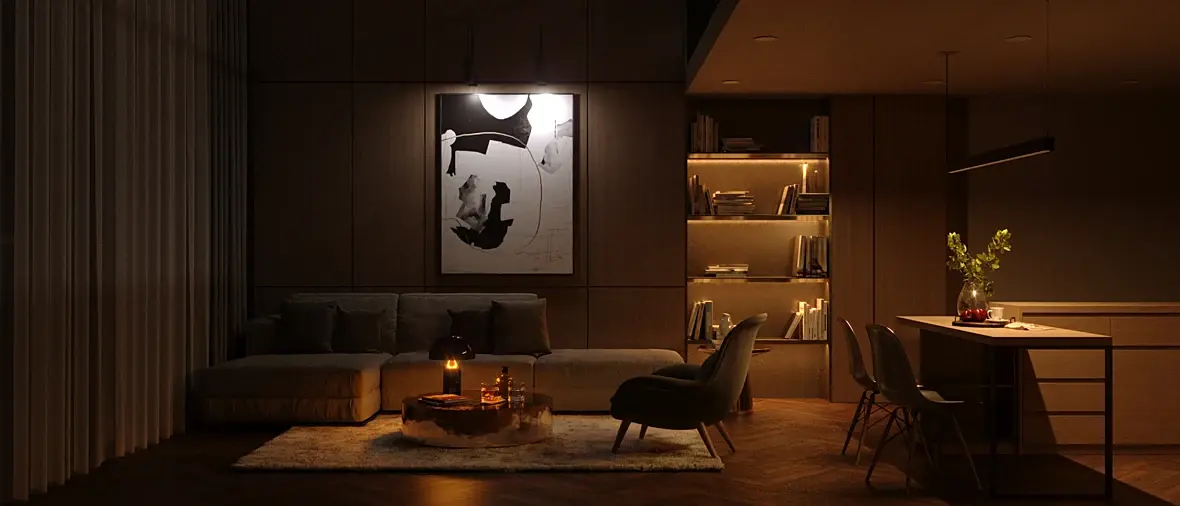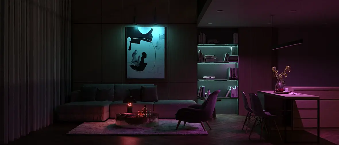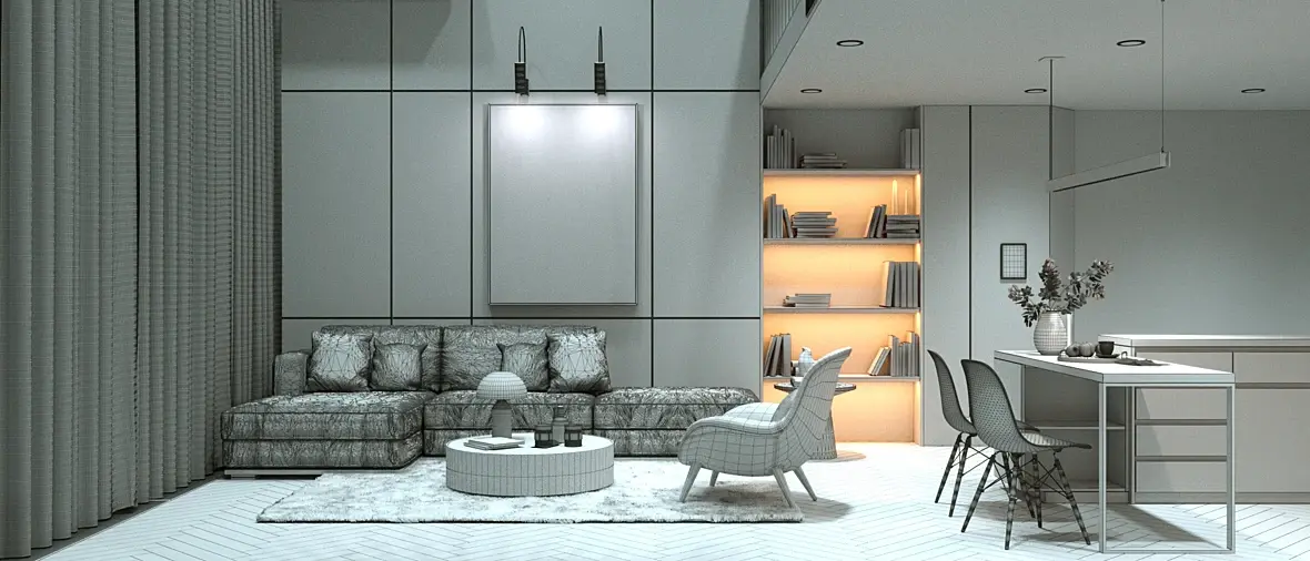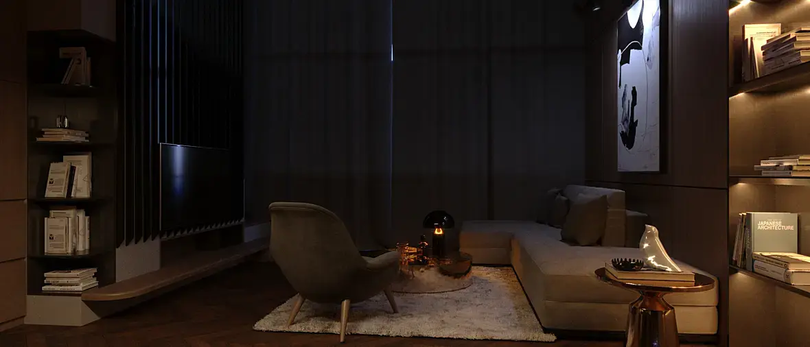 Этот "специальный" пересвет смотрится очень дико и резко перетягивает на себя всё внимание, отчего ещё хуже воспринимается.. И подушки на диване очень плохие и пластилиновые - попробуйте другие, более удачные модели использовать. |