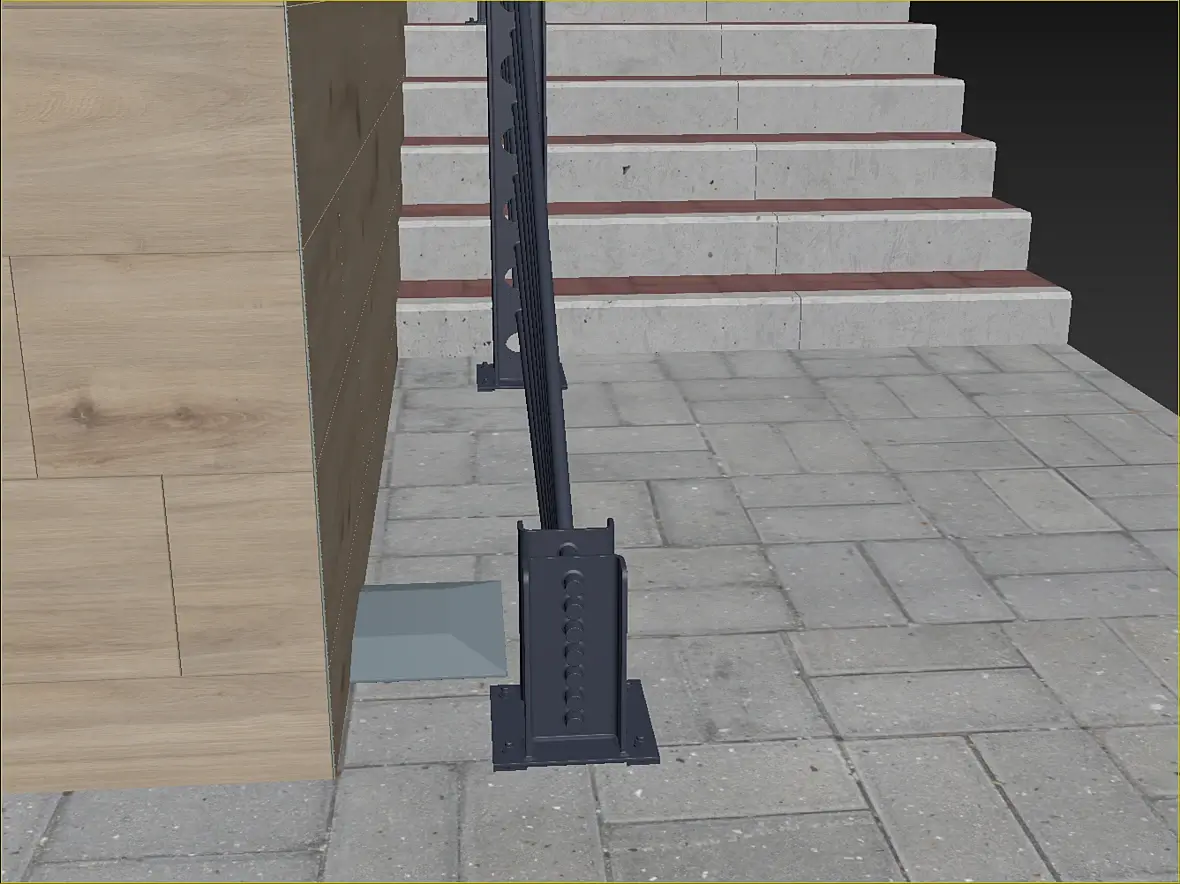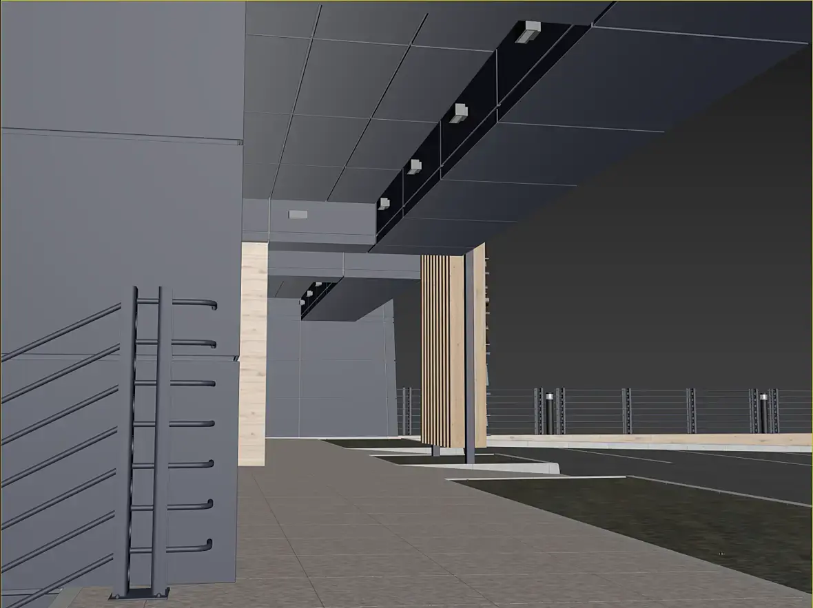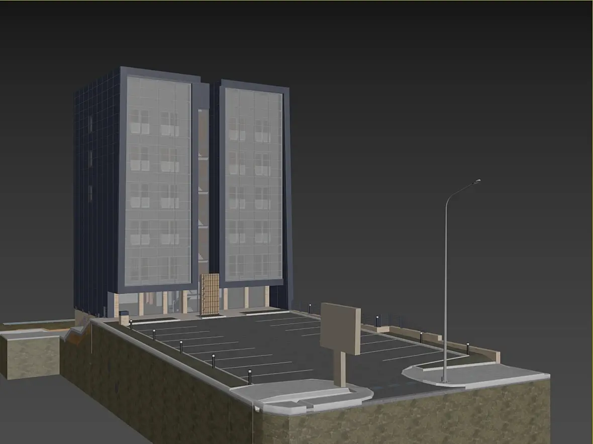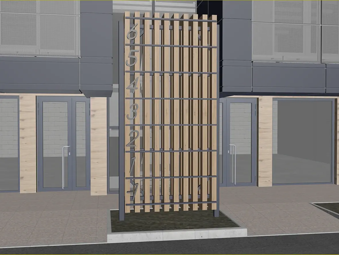 И стела. Идея очень простая и не новая. Реклама нужна, на здание на фасад не хочу лепить. Да и этажей много, так же как арендаторов или хозяев, куда это все писать, а тут есть куда и этаж сразу видно. Выполнил её из металлоконструкции и клееного бруса. Без света и тени, конечно тот еще вид, так же как и перфорации. Но это позже