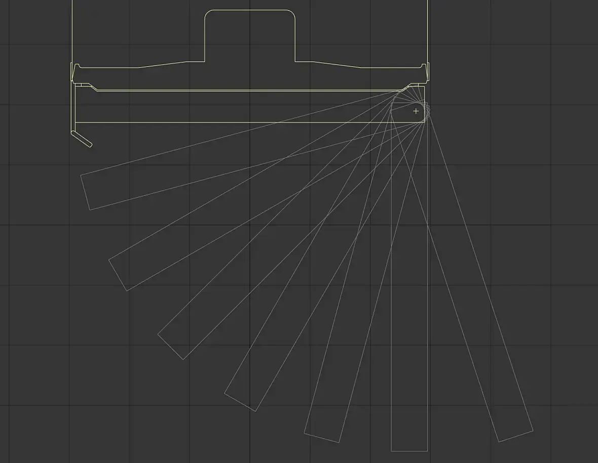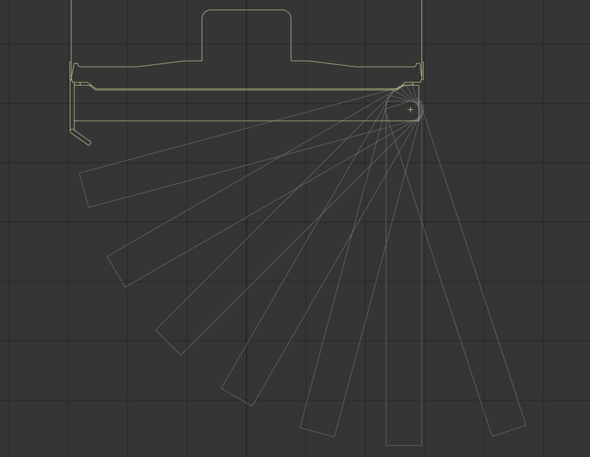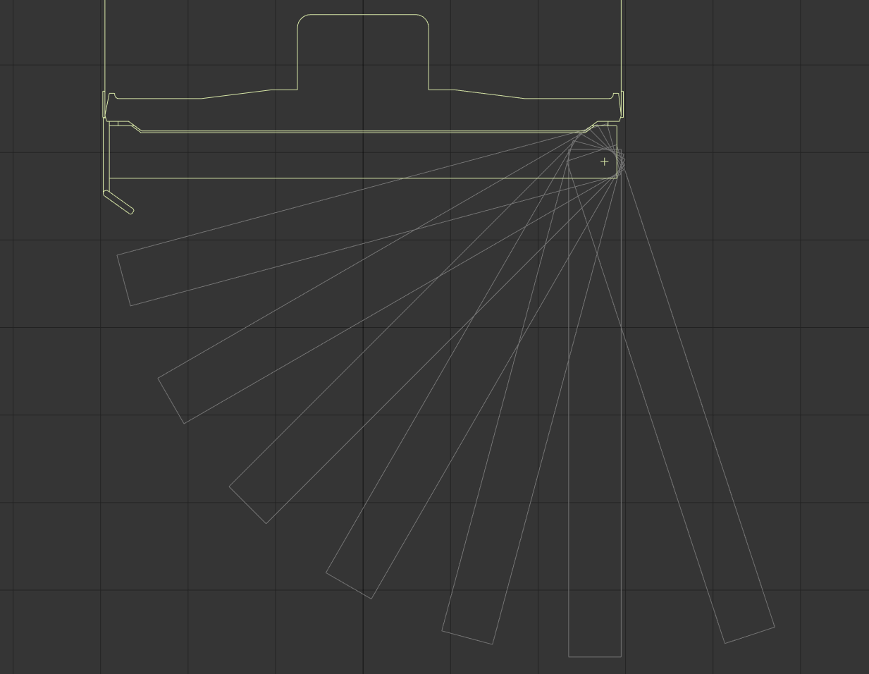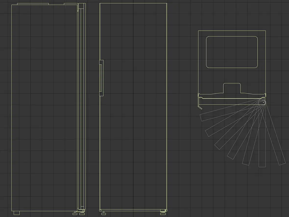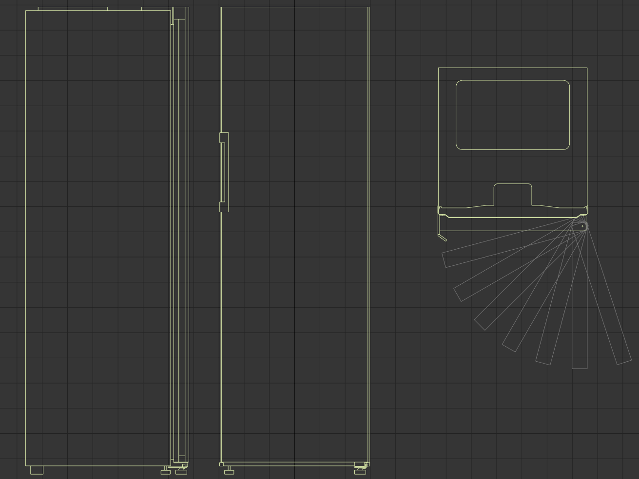 Информации конечно мало по ним технической, отдел Samsung холодильников сильно меньше её дает чем отдел духовых шкафов. Исходя их этого и того что времени не так много, буду стараться делать модель максимально простой. Ось вращения створки рассчитал сразу, так как она мне поможет в моделировании смежных элементов. Не совсем идеально получилось, но в базовые известные размеры вписался по координатам створки. А вот в выходе створки за габариты холодильника не вписываюсь, не достаток информации...