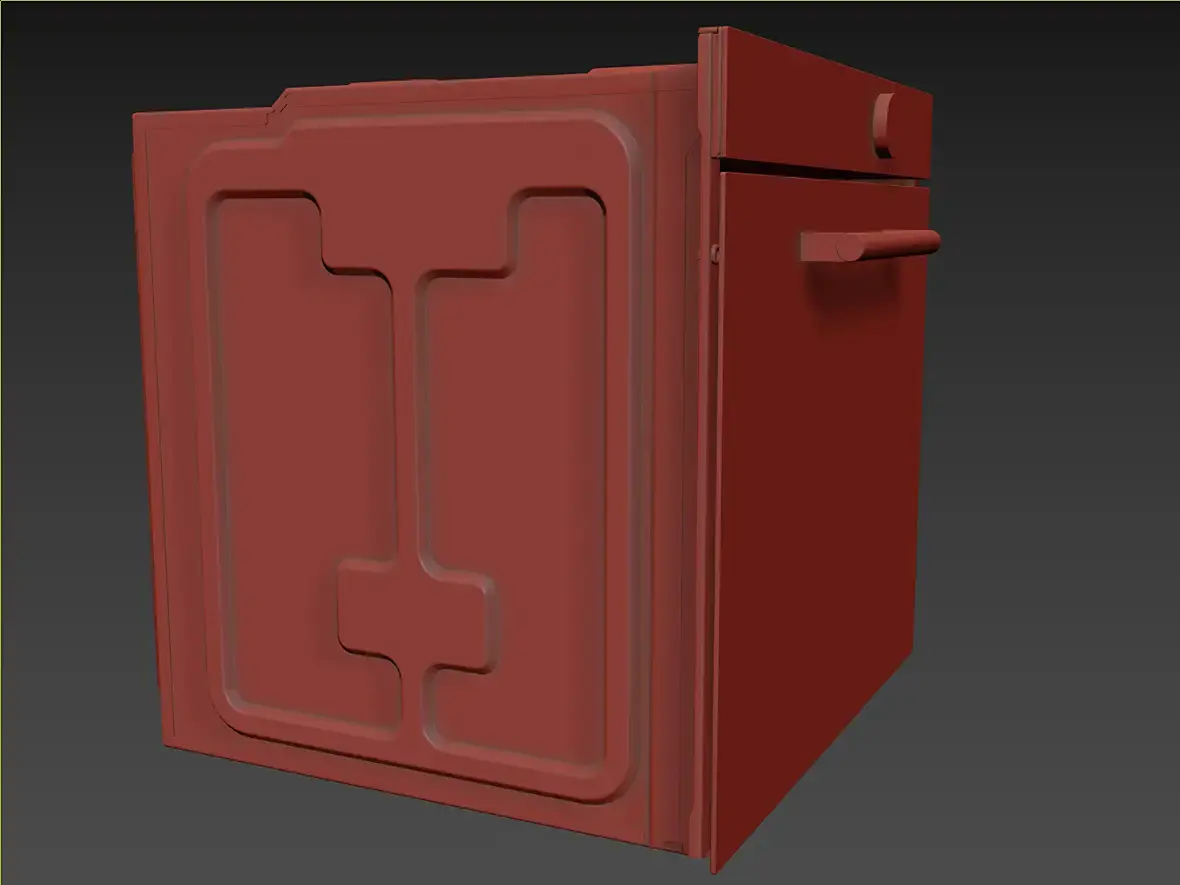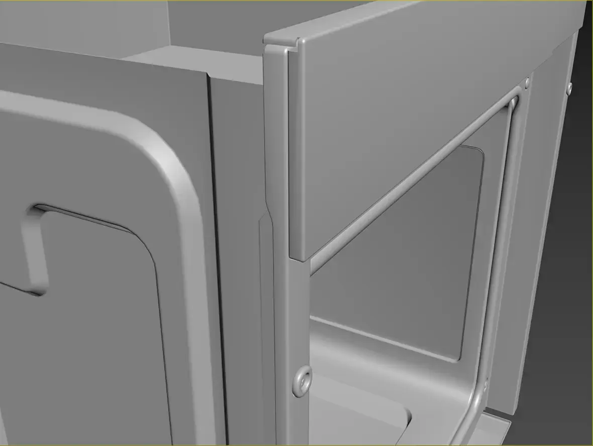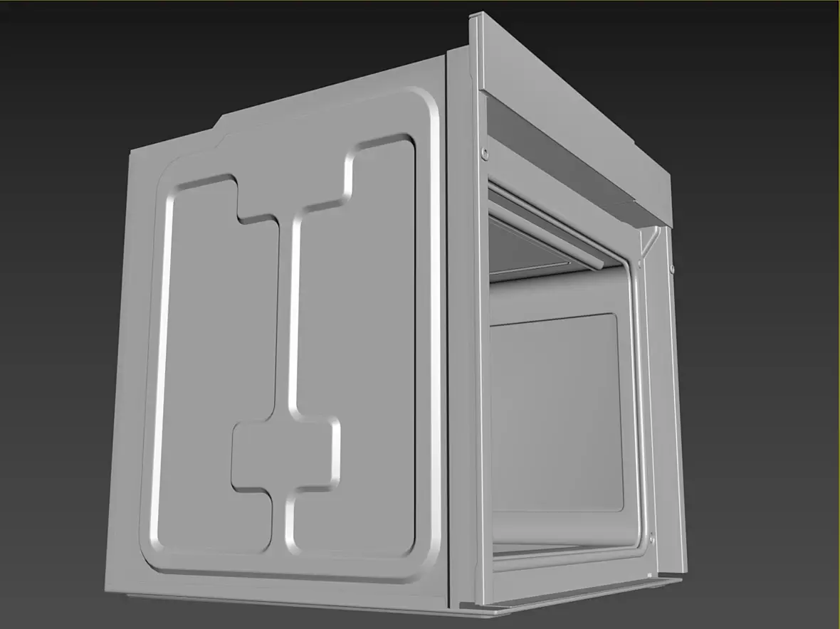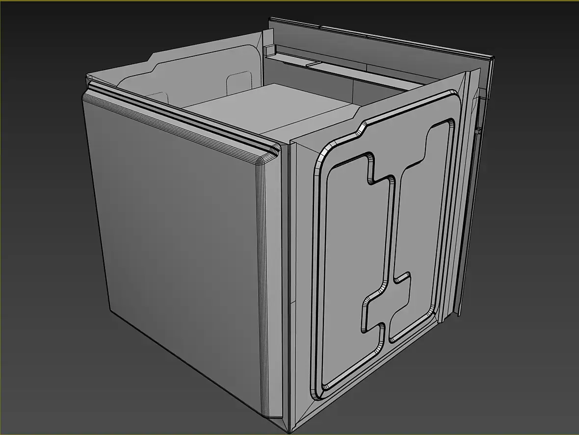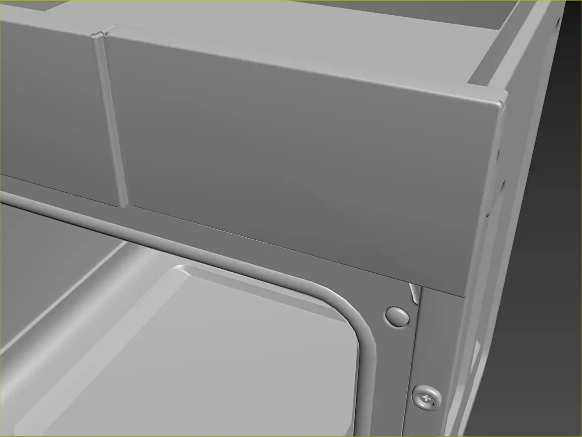 Вех приветствую. У меня вроде с геометрией всё, для текущей задачи, как и писал выше, навесное внутреннее пока не буде делать. Переработал в части уплотнителя и отбойников створки, младшего брата моего персонажа глянул, действительно накосячил. Так же меня смущала глубина шкафа, внутренняя рабочая, проверил объём по литрам, действительно много, подогнал, вроде лучше. В верхней части добавил детали на средний элемент, между лицевой панелью и основной выштамповкой. Сделал лицевые панели, джойстик и ручку.