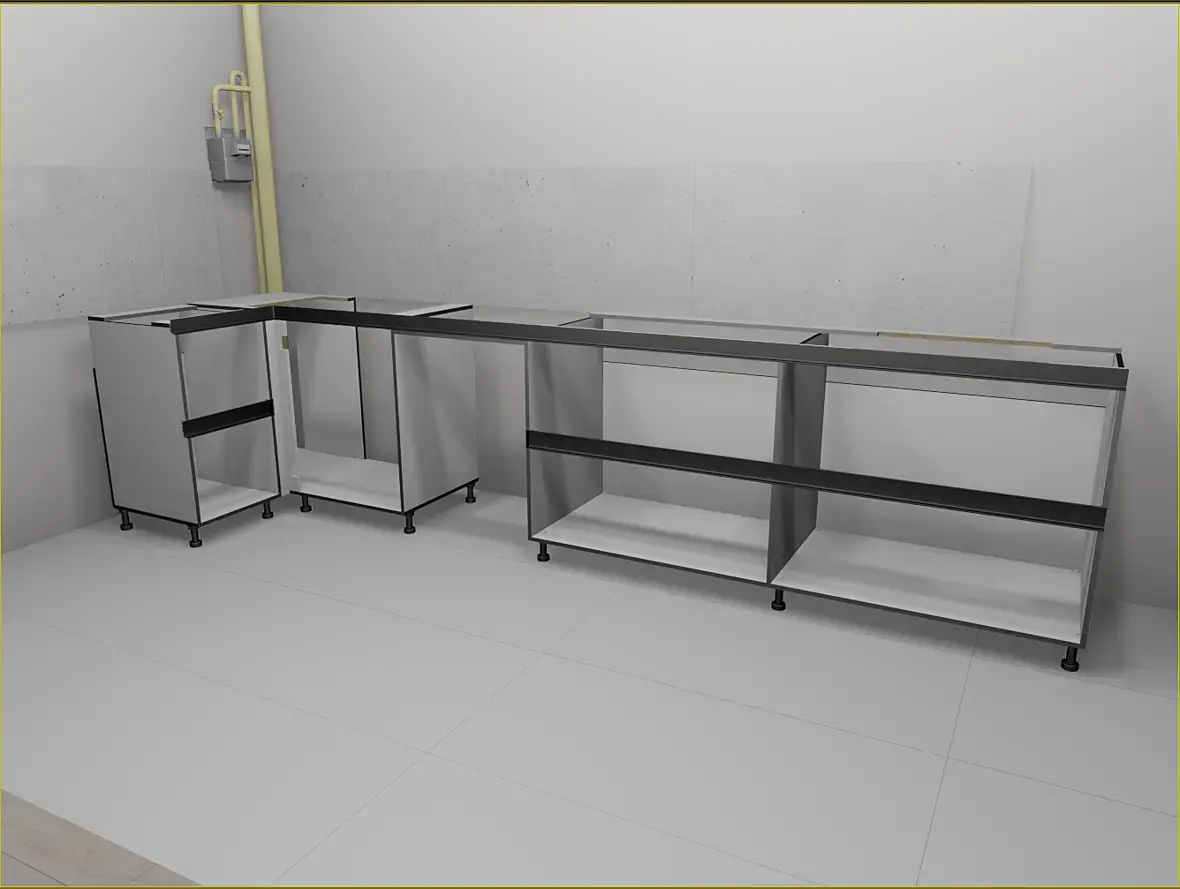 Но всё же я больше доволен, чем не доволен результатом. Для начала я полностью подчистил размеры в модулях базы, убрал всё не кратные 1мм, такие появляются в основном из за фурнитуры, там часто десятые присутствуют и из за зазоров в 3 мм по фасадам. Так же проработал корпусы модулей правого шкафа. Выглядит так пока.