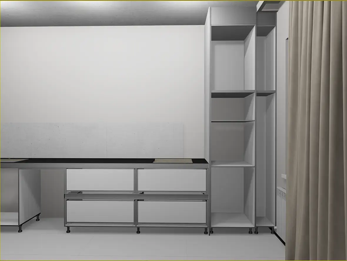 Но всё же я больше доволен, чем не доволен результатом. Для начала я полностью подчистил размеры в модулях базы, убрал всё не кратные 1мм, такие появляются в основном из за фурнитуры, там часто десятые присутствуют и из за зазоров в 3 мм по фасадам. Так же проработал корпусы модулей правого шкафа. Выглядит так пока.