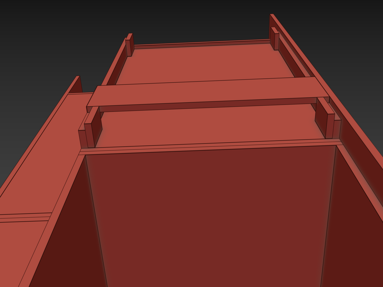 После перерыва еще два с половиной часика помоделил. Доработал нижнюю часть, сделал более детально примыкание нижней панели к остальным. Добавил опорные площадки. И еще один элемент не понятный.